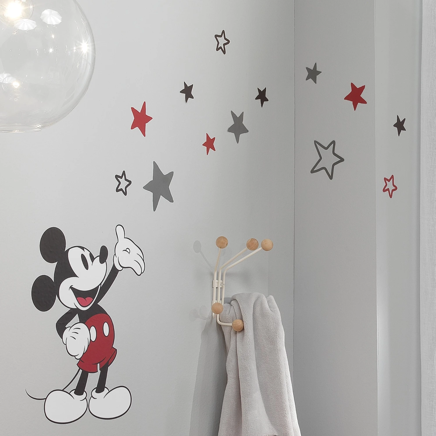 Complete this charming nursery with these custom wall decals. They add a designer touch to a feature wall in the baby’s room. Disney’s timeless Mickey Mouse is featured in his favorite red shorts and is surrounded by magical stars in black, red and gray. These wall decals create the look of a mural without any of the hassle of paint. They are easy to apply and easily removable. They will not harm your walls. SKU: 598048, UPC: 084122009035.