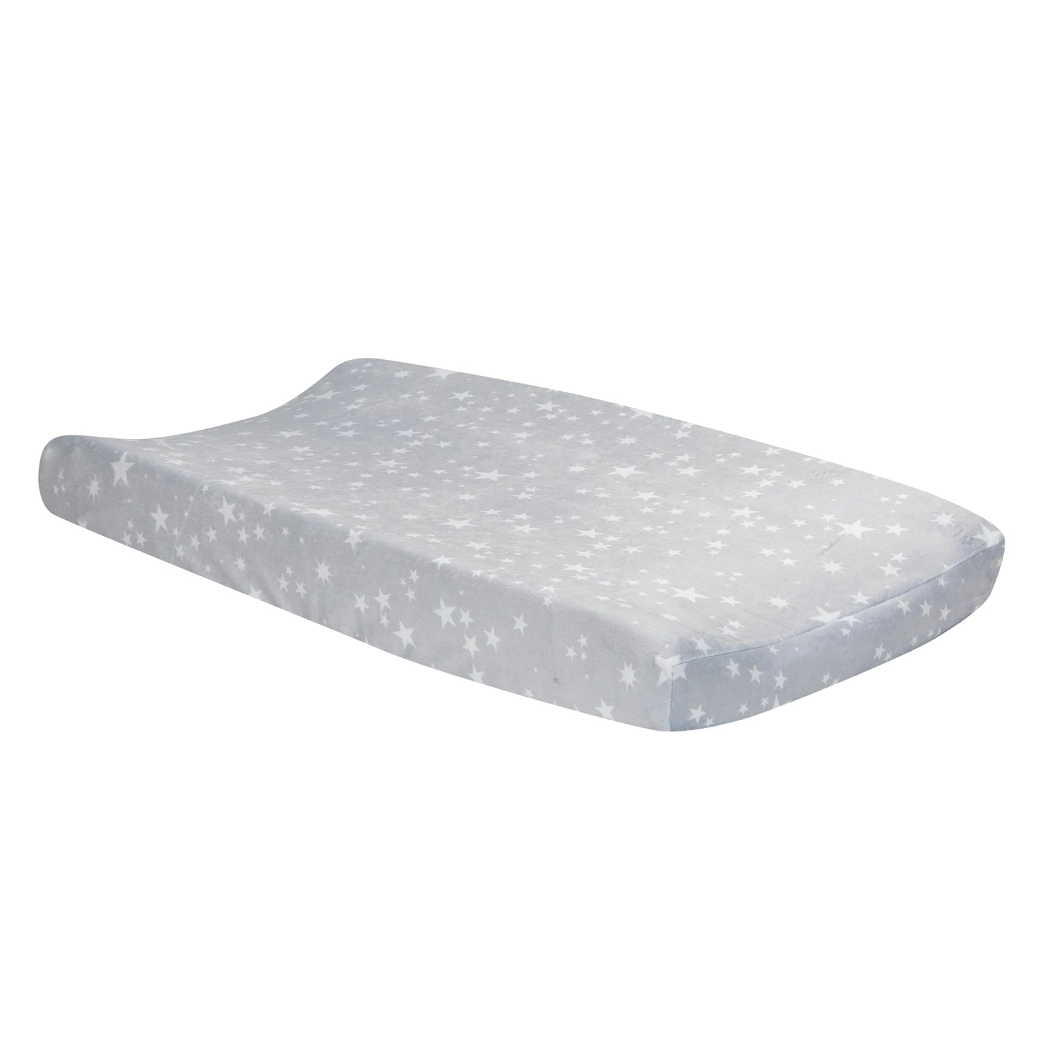 Your baby will shine on this super soft minky changing pad cover featuring white stars of various sizes on a soft gray ground. It is 16” wide by 32” long and fits most changing pads. It has summary holes for your changing pad straps, so baby is secure while getting their diaper changed. It is made of a soft polyester which is highly durable, retains its shape, resists wrinkles and is easy care. Imported. SKU: 730050, UPC: 084122730502.