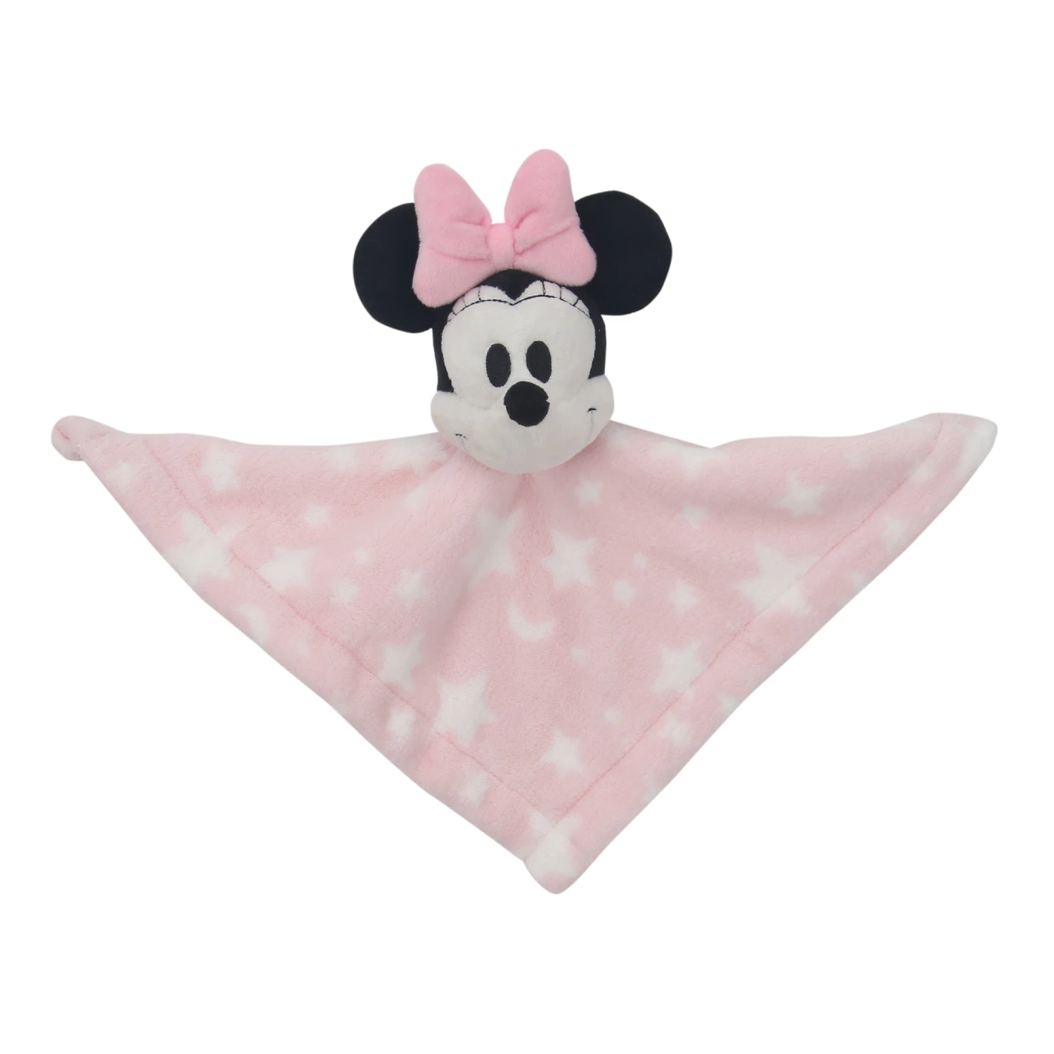 Our pretty pink security blanket / lovie has tossed white moons and stars and makes a great comforting companion for your little one. Minnie Mouse is one of the most loveable characters in the Magic Kingdom. The security blanket is made in an ultra-soft fleece and is 12” X 12” which is perfectly sized for little hands. Minnie’s face is embroidered on white velour, her ears are black velour, and she is wearing her signature pink bow. Security blankets / lovies help babies self soothe. SKU: 789034MPS, UPC: 084122015173.