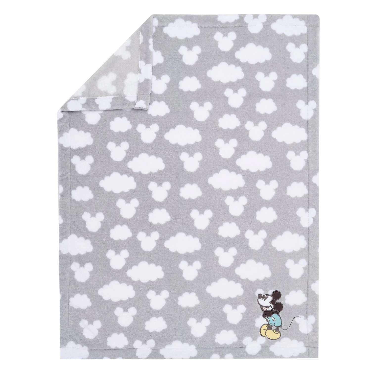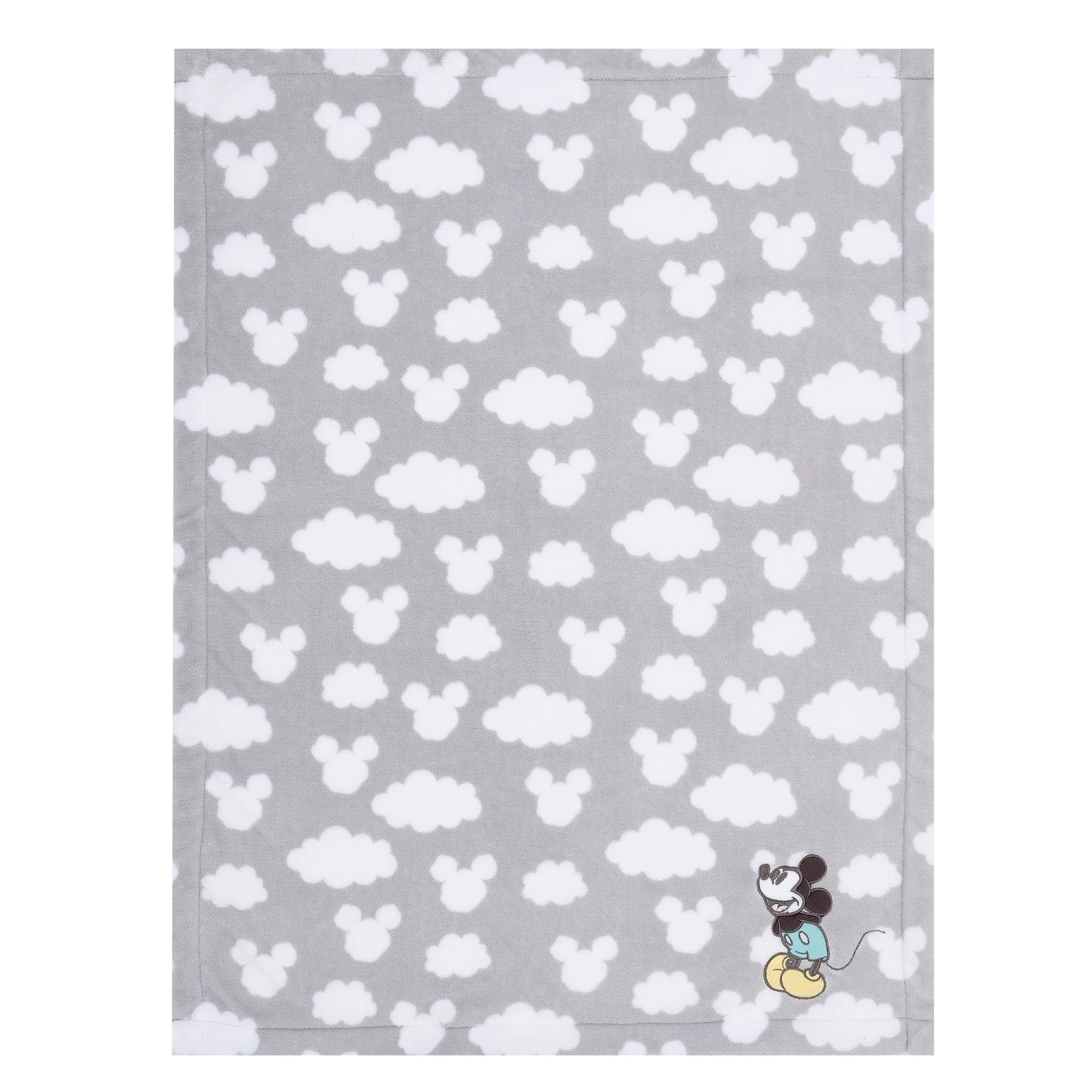 Mickey Mouse is appliqued on the lower right side of this soft fleece baby blanket. He is on a gray ground with puffy white Mickey Mouse silhouette clouds. Mickey is wearing his favorite blue shorts and yellow shoes. The blanket is a soft fleece fabric and is 30” X 40” making it a perfect sized stroller blanket. It makes a great baby shower gift or welcome home baby gift. SKU: 668034, UPC: 084122015807.