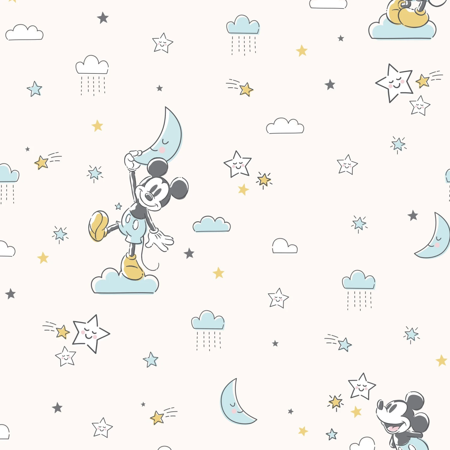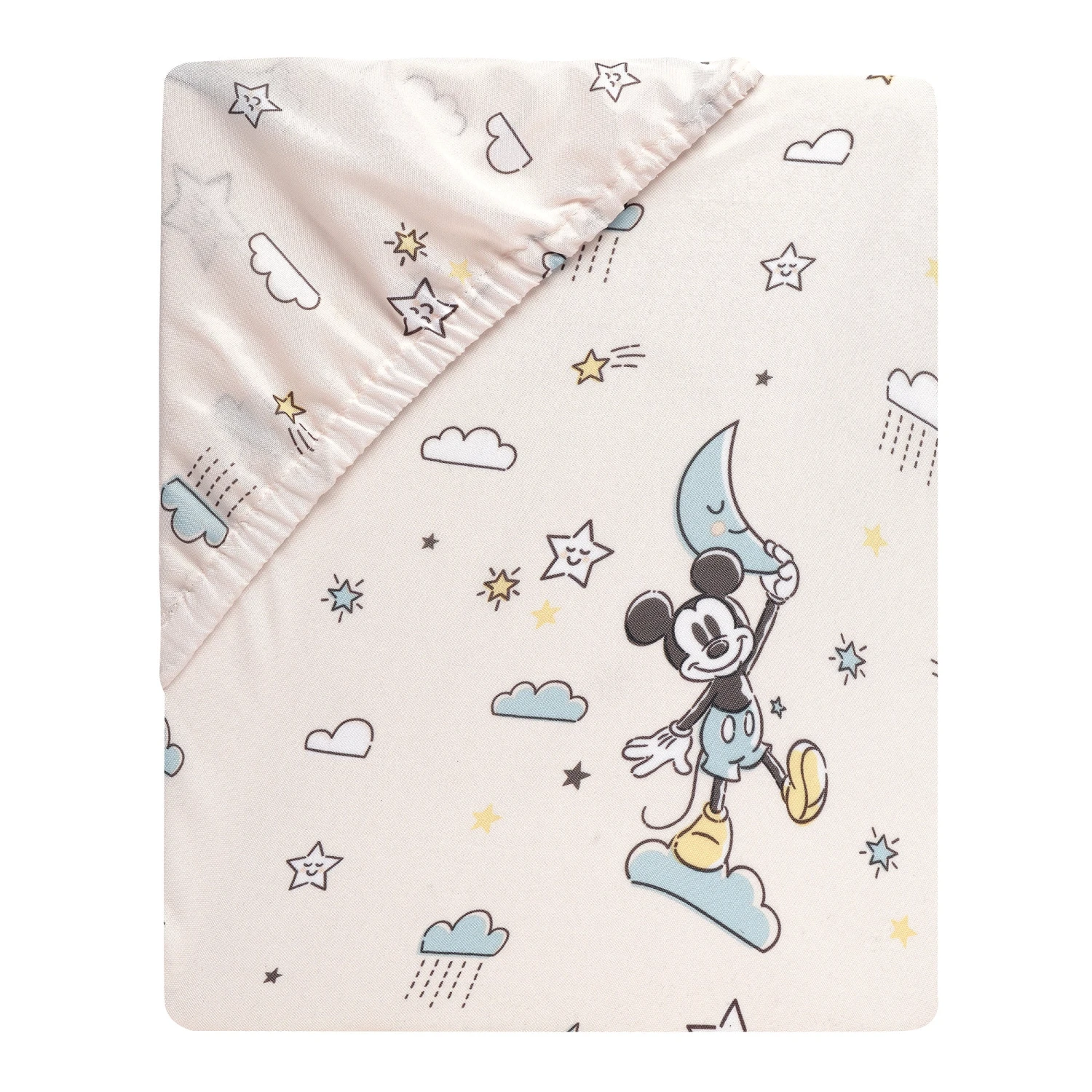 This soft microfiber fitted crib sheet is on a creamy white ground with Mickey Mouse in different poses surrounded by moons and stars. The fitted crib sheet has elastic all the way around ensuring a safe and secure fit on a standard size crib mattress measuring 28” X 52”. It is machine washable for easy care. SKU: 668006B, UPC: 084122015791.