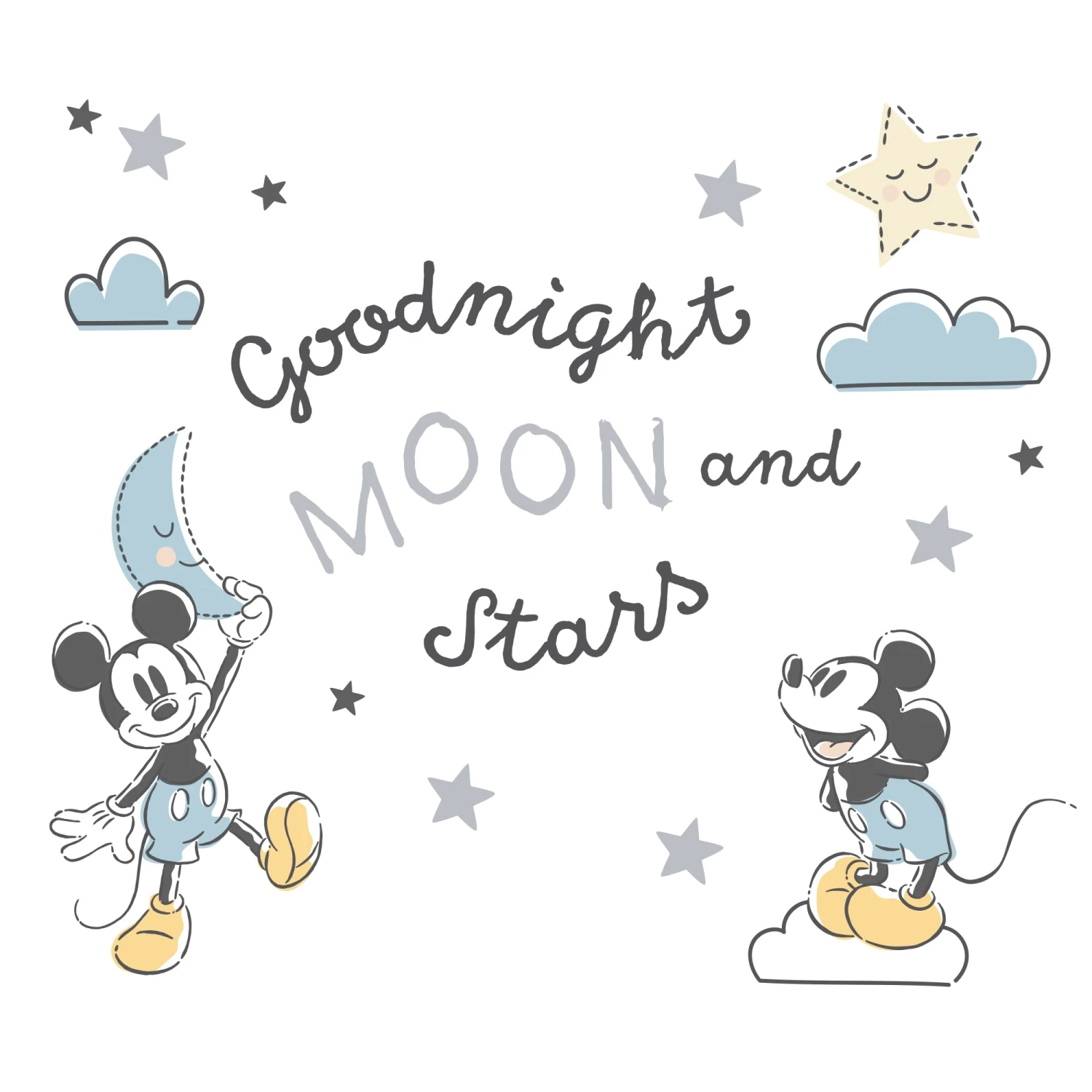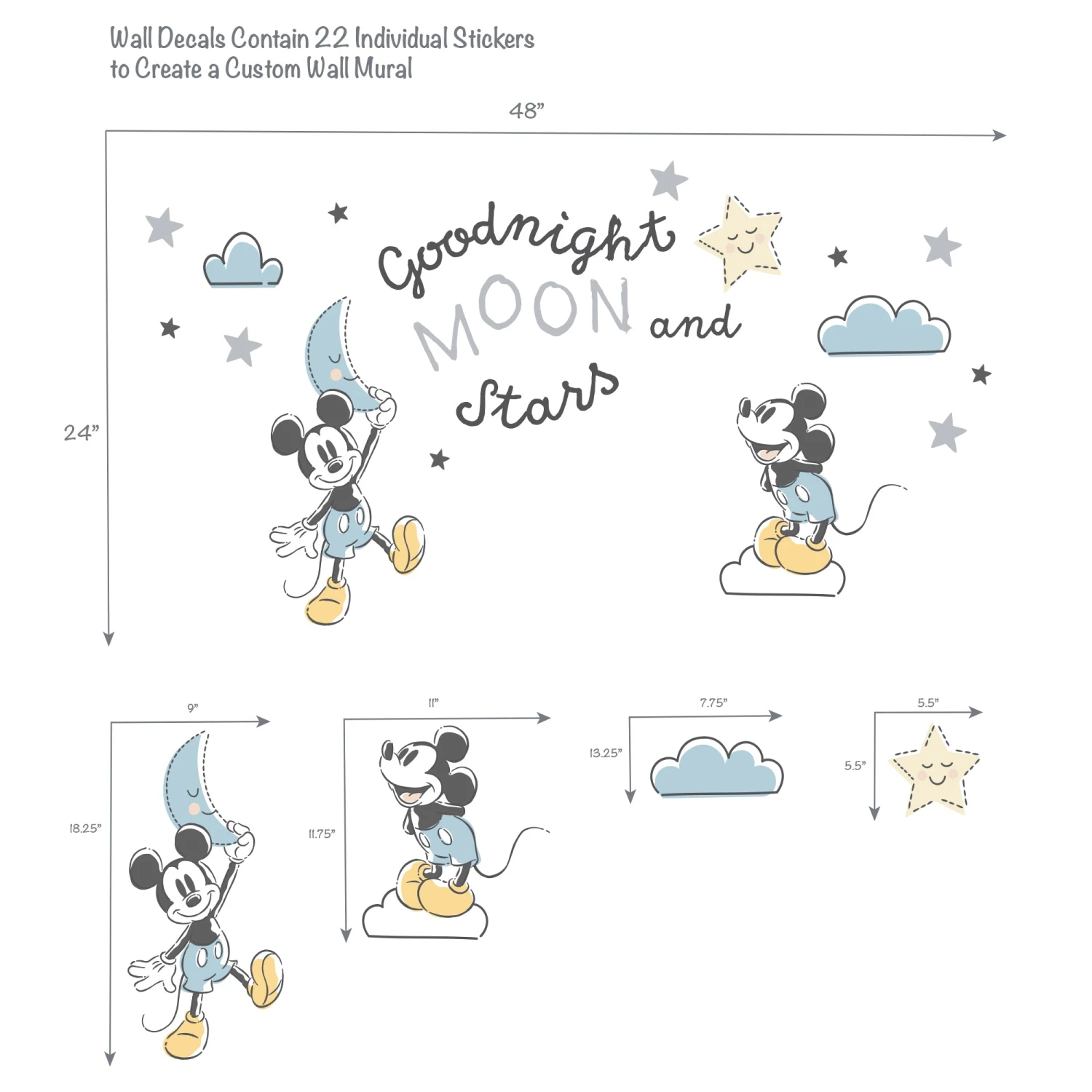 Complete your charming Moonlight Mickey nursery with these custom wall decals. They will add a designer touch to a feature wall in your child’s room to create a mural-like look. There are 3 sheets that are 12” X 18” with a total of 22 pre-cut pieces. The finished size is approximately 24” X 48” when applied as shown. Featured are 2 Mickeys in blue shorts, yellow shoes, and white gloves along with stars, clouds, a crescent moon and the words Goodnight Moon and Stars. These decals are easy to apply and work best on smooth surfaces. SKU: 668048, UPC: 084122015838.