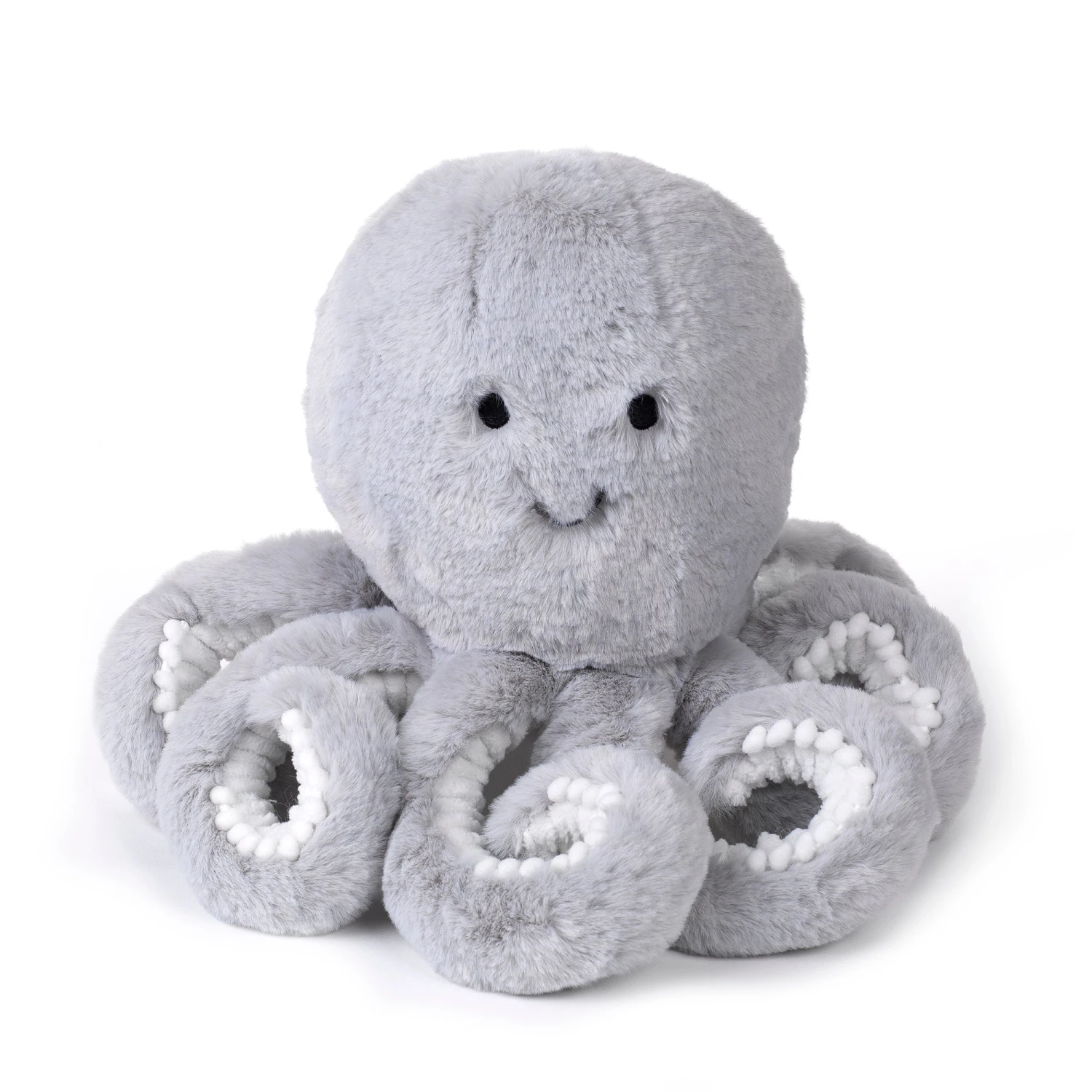 Meet Inky. He is the cutest little gray minky octopus stuffed animal plush toy. He has white ribbed velour under his tentacles along with white pompom trims. His eyes and mouth are embroidered making him safe for all ages, even babies. Perfect for cuddling with your little one and sure to become their best plush friend. SKU: 880043O, UPC: 084122007437.
