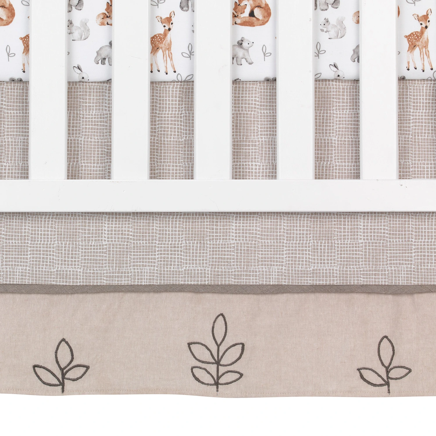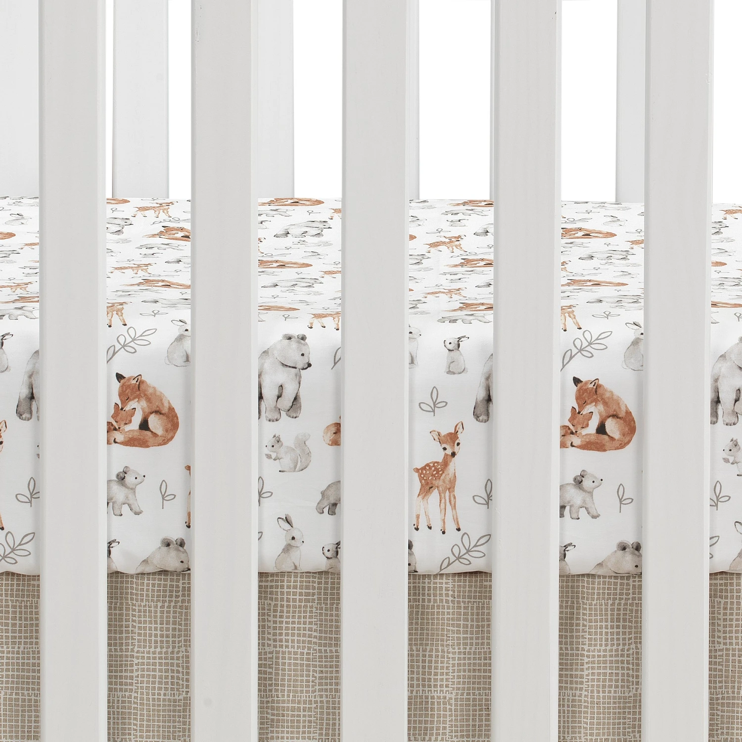 Welcome your little one home with a charming nursery filled with friendly forest water colored painted animals. Mommy and baby bears, foxes, and bunnies lovingly interact with each other. A delicate deer and a happy little squirrel join in the fun. The four-piece baby bedding set includes one quilt, one 100% cotton fitted crib sheet, one crib skirt and one wearable blanket. Beautiful textured fringe, embroidered leaves and a modern chevron border decorate this adorable 100% cotton sateen bedding set. An embroidered leaf design is featured on the front of the crib skirt and the cotton fitted crib sheet features sweet watercolor forest animals. Included in the bedding set is a 100% cotton wearable blanket with a little furry white bear on the front corner next to baby’s heart. It fits a 10 to 18 pound baby and is recommended for safe sleep. SKU: 713004V, UPC: 084122713048.