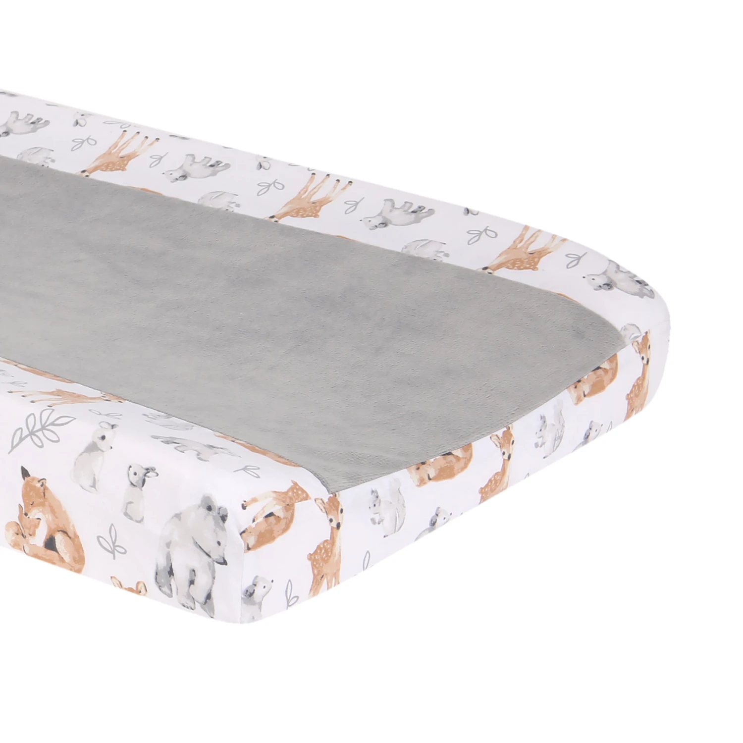 A soft gray furry minky center is perfect for changing your little one. The side panels are a pretty watercolor 100% cotton print of our favorite woodland animals including foxes, bunnies, bears, deer and foliage. There are summaryholes for the changing pad straps so your little one is safe and secure while getting their diaper changed. SKU: 713050N, UPC: 084122010574.