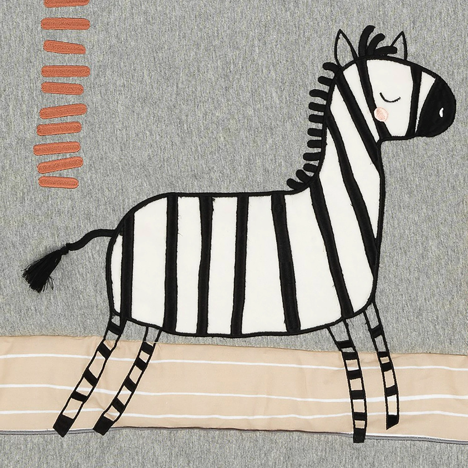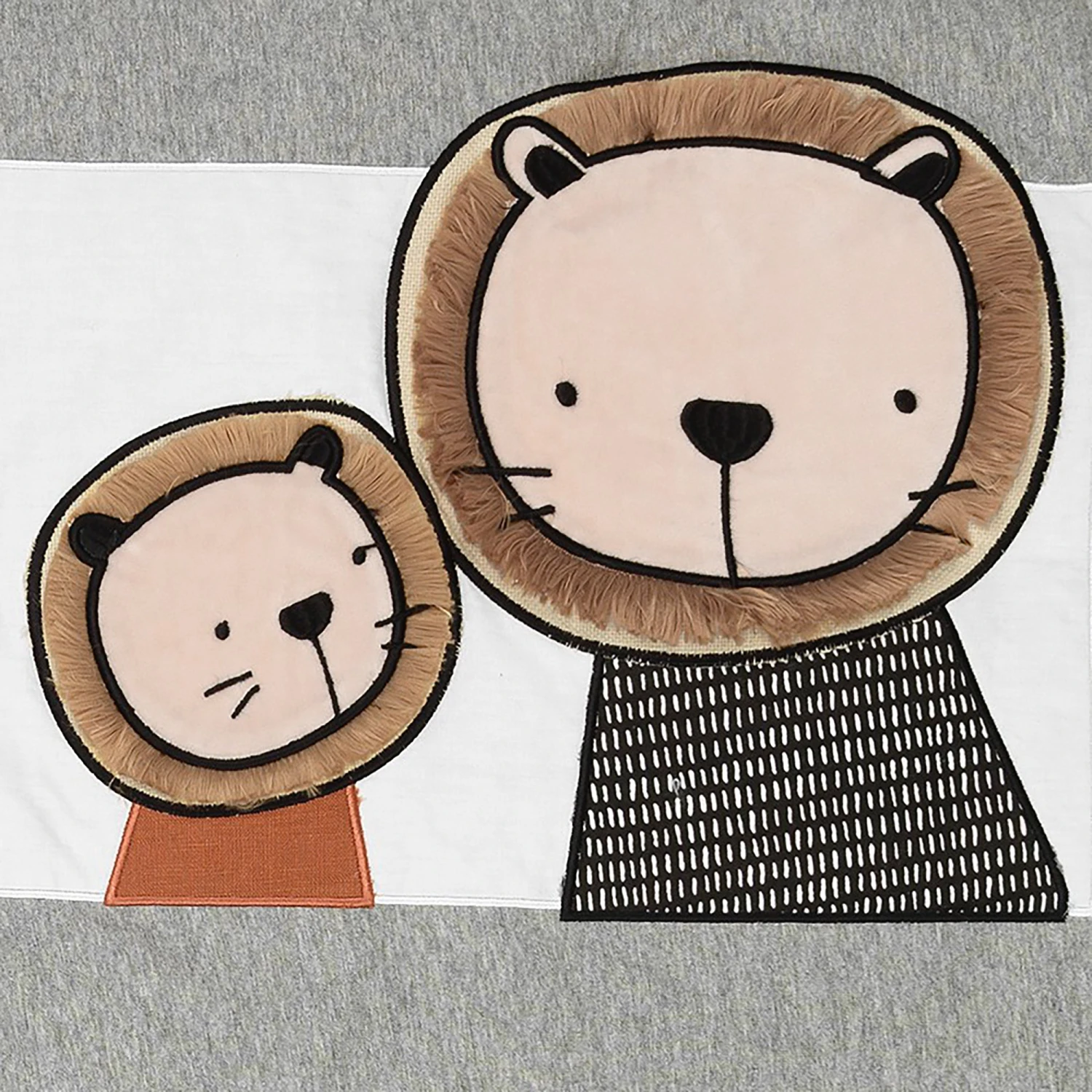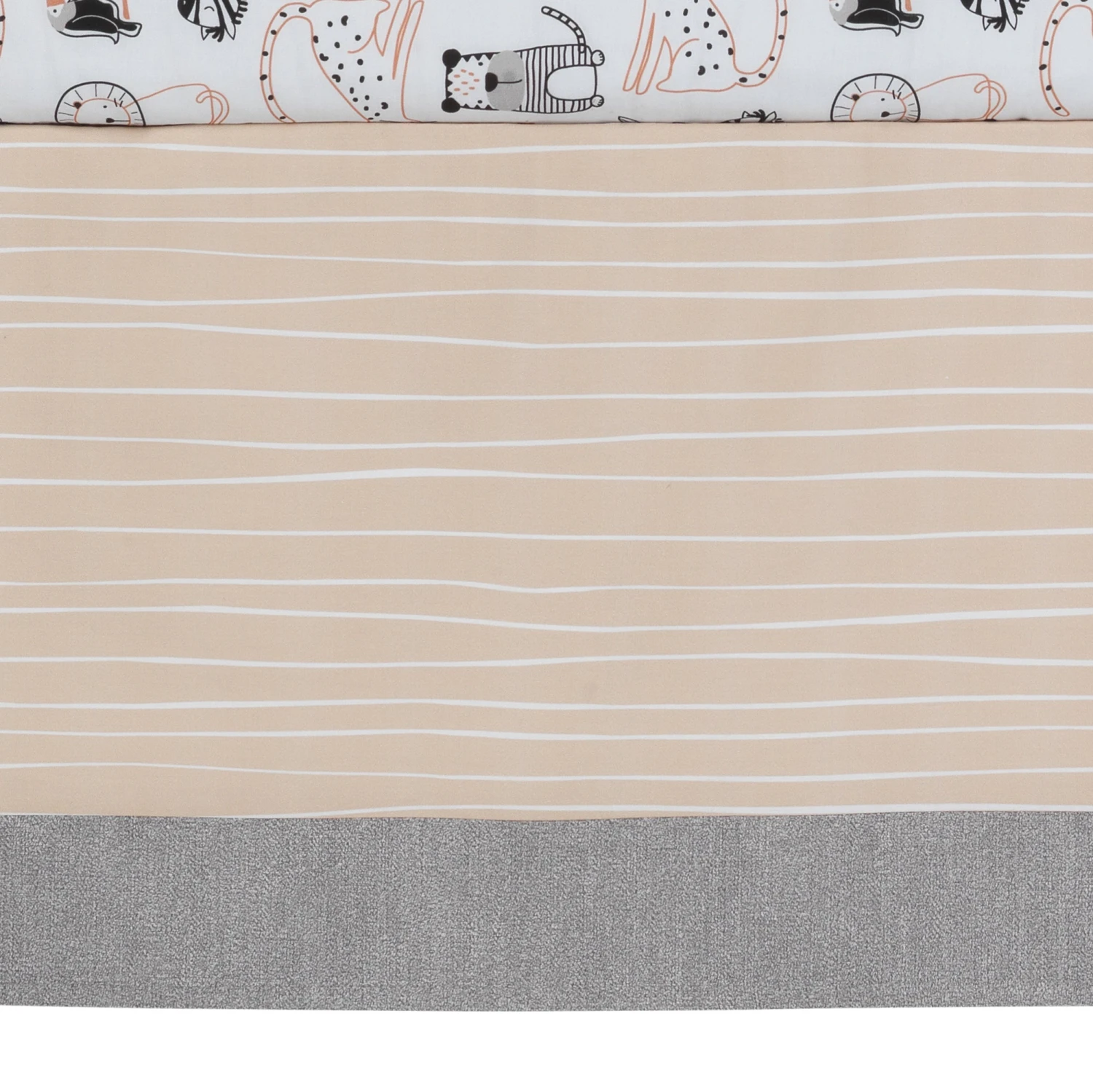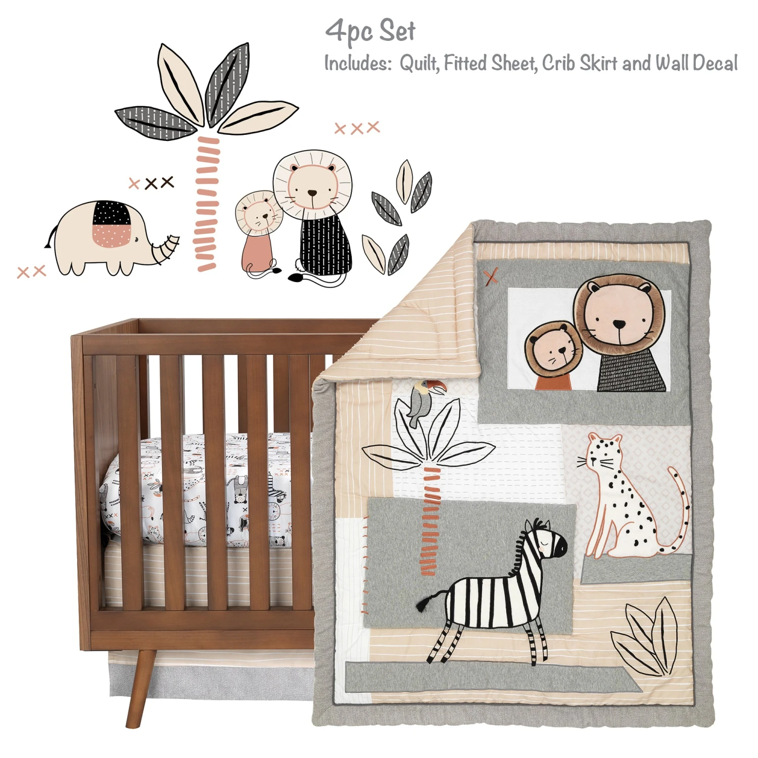 This four-piece crib bedding set includes one quilt (36” X 45”), one breathable 100% cotton fitted crib sheet, one crib skirt and a complete set of wall decals. Soft and cozy fabrics include minky, jersey, velour and plush. Designed with heather gray jersey, creamy colored velour, white plush and upscale woven fabrics this collection will welcome home your little safari adventurer in modern style. The breathable 100% cotton fitted crib sheet is a tossed print on a white ground featuring an elephant, leopard, zebra, tiger, and toucan. There is elastic all the way around ensuring a safe and secure fit on a standard sized crib mattress measuring 28” X 52”. The crib skirt adds the finishing touch to your child’s crib. The upper panel is a cotton twill with white horizontal stripes over a speckled woven gray border. The crib skirt has a 14 ½” long drop. The wall decals are a great way to create a mural-like look in your child’s room. There are four sheets that are 12” X 18” with a total of 21 die-cut pieces. There is the mommy and baby lion, a friendly modern elephant, a 17” tall palm tree, leaves and X’s. These are easy to apply on smooth walls and easy to remove. SKU: 718004V, UPC: 084122013445.