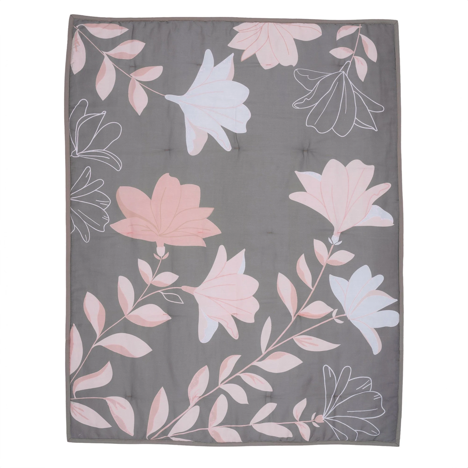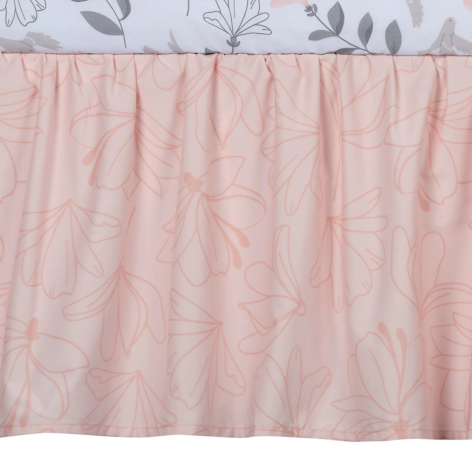 This enchanting baby crib bedding set includes one quilt, one breathable 100% cotton fitted crib sheet, and one decorative crib skirt. The stunning quilt front is 100% cotton sateen on a mink gray ground with beautiful flowers and leaves in petal pink, blush, soft rose and white. The back of the quilt is a cotton twill blend on a petal pink ground with outlined flowers. The breathable 100% cotton fitted crib sheet is on a soft white ground with elegant gray leaves, soft petal pink flowers and sweet open winged birds. There is elastic all the way around ensuring a safe and secure fit on a standard sized crib mattress measuring 28” X 52”. The crib skirt adds the finishing touch of elegance transforming the crib into the centerpiece fit for a fairytale. It is on a petal pink ground with delicate outlined flowers and has a 14 ½” drop gracefully concealing most of the crib frame. SKU: 702003V, UPC: 084122019089.