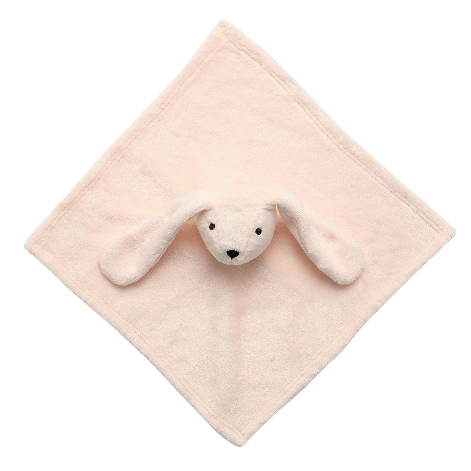 What could be better to comfort your little one than this adorable soft and cozy fleece security blanket / lovey? The pink bunny’s long inner ears are made in a soft textured white ribbed velour, and her face is expertly embroidered in black making her baby safe. The blanket portion is 12” X 12” and is made in a ultra soft luxury fleece. Security blankets (loveys) are cuddly companions that help baby learn to self soothe. SKU: 715051BU, UPC: 084122016156.