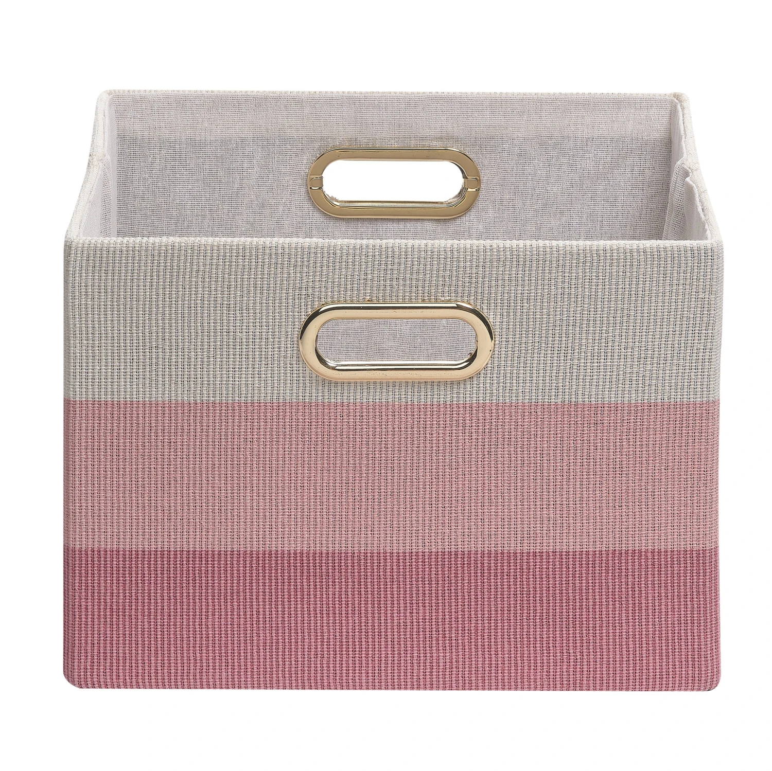 These sturdy ombre storage baskets are the perfect addition to your stylish nursery, playroom, kids’ room, and even your office. They are made in a cross-weave textured cotton, poly, rayon fabric with a poly cotton rayon lining. There are two built in gold metal handles for easy carrying. The baskets are 12 ½” X 11” X 9”. The color sequence is natural cream at the top, medium pink in the middle and dark pink at the bottom. Spot clean only. SKU: 170PF, UPC: 084122014978.