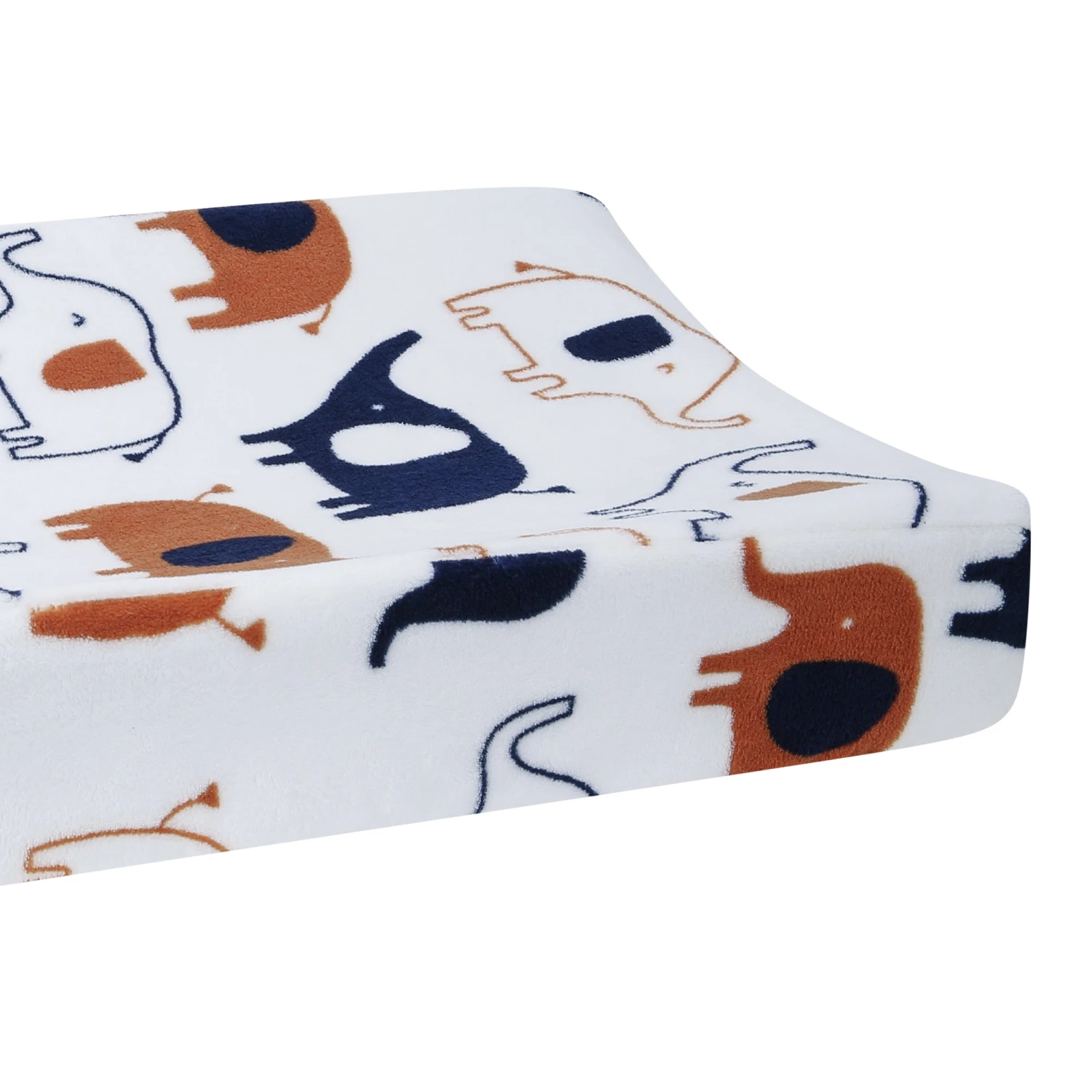This ultra soft white coral fleece changing pad cover is perfect for keeping your little one warm and cozy during diaper changes. It is on a creamy white ground with cute elephants in indigo blue, caramel and white. There are summaryholes for the changing pad straps so your little one is safe and secure while having their diaper changed. Elastic on the short sides provide for a better fit. It is machine washable for easy care SKU: 653050, UPC: 084122017894.