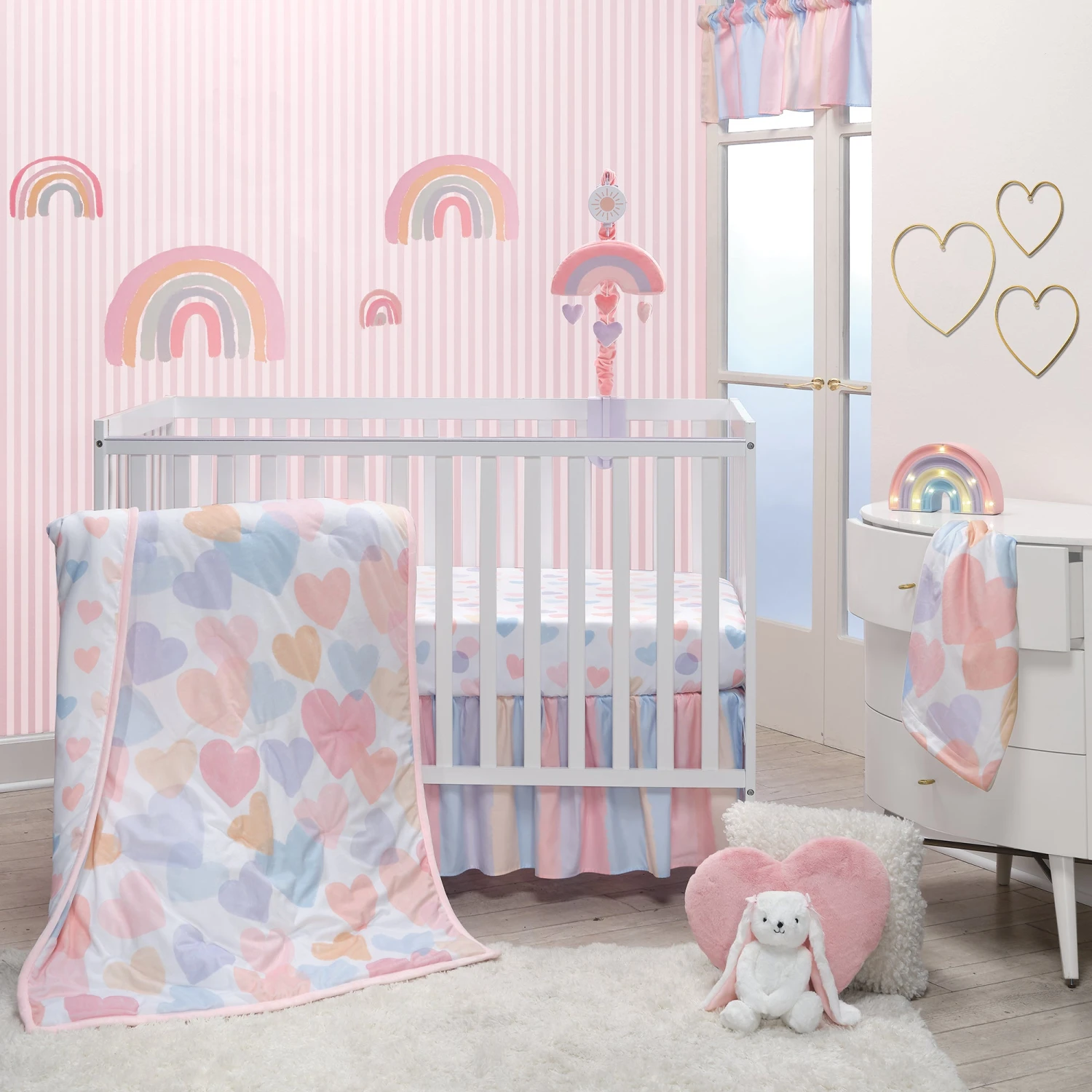 Your little one will be comfy and cozy on this soft microfiber fitted crib sheet. Hearts and dots in pretty pastel colors decorate this stunning sheet. It has elastic all the way around ensuring a safe and secure fit on a standard sized crib mattress measuring 28” X 52”. It is machine washable and dryable for easy care. SKU: 247006B, UPC: 084122016927.
