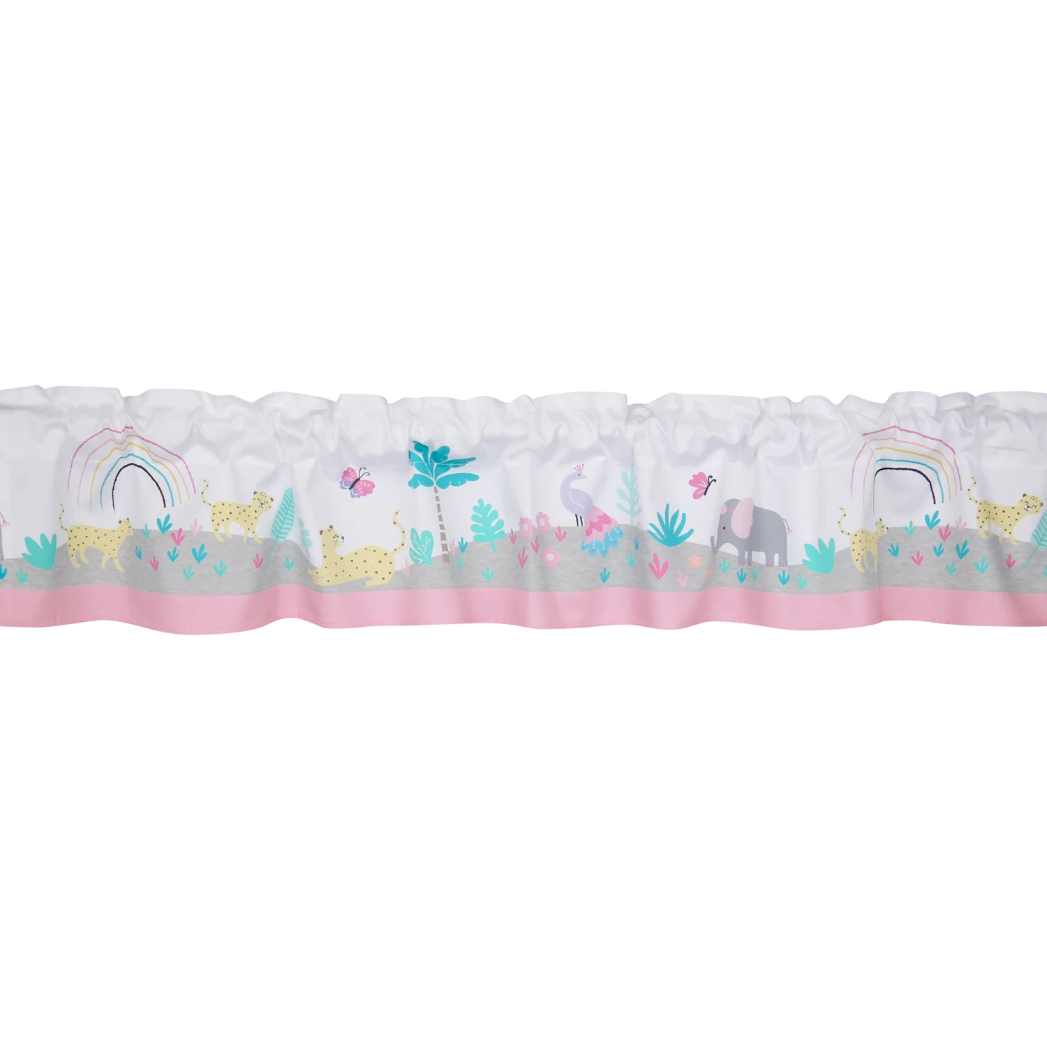 Add a finishing touch to your child’s room with this colorful Rainbow Jungle window valance. It features our cute gray elephant with pink ears, a friendly yellow leopard, pretty lavender peacocks, arched rainbows, trees, butterflies, flowers, and leaves. It is 54” long and 10” high with a rod pocket for easy hanging. And…it is washable for easy care. SKU: 243029, UPC: 084122014718.