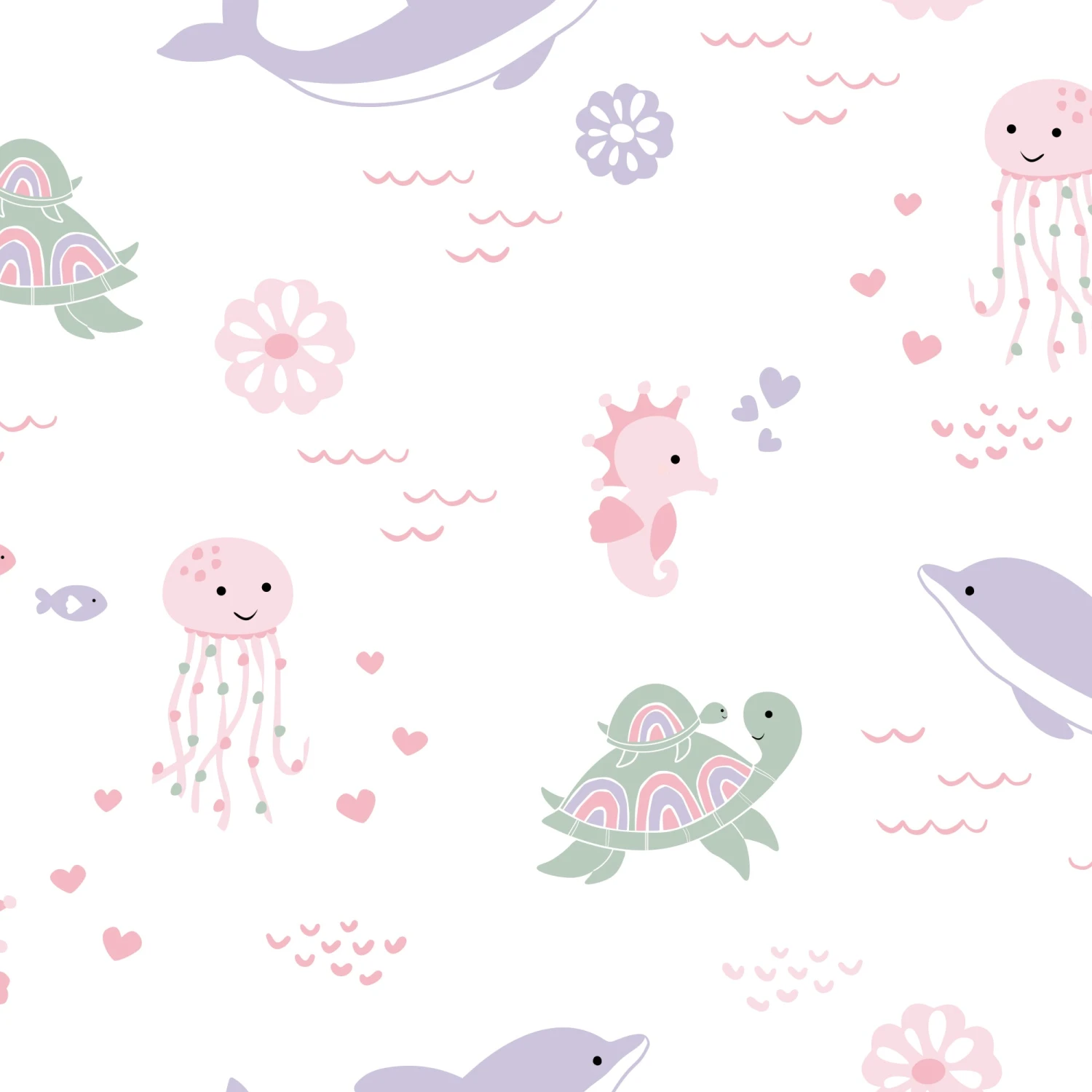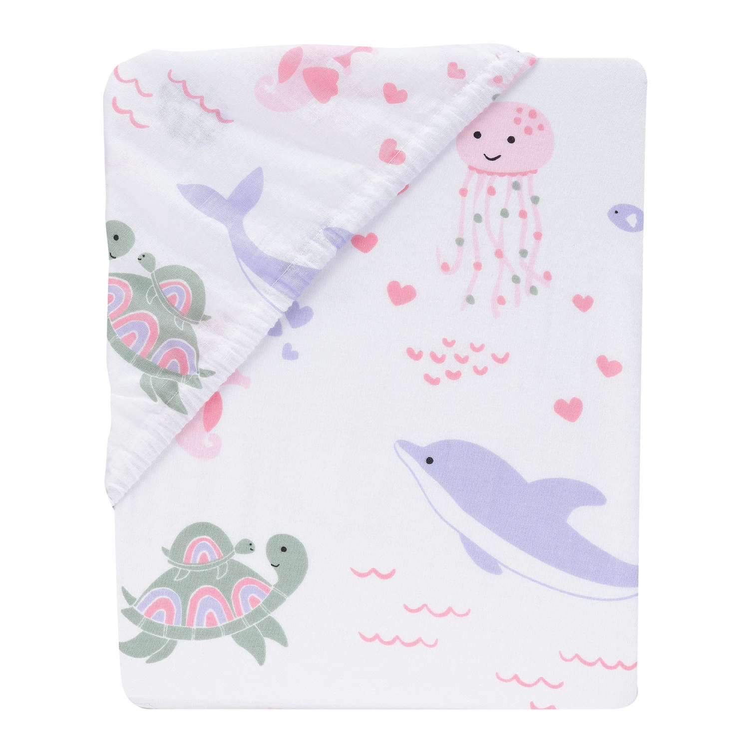 Your child will have a dreamy night’s sleep on this nautical, ocean themed breathable 100% cotton fitted crib sheet featuring dolphins, sea turtles, jellyfish, sea horses, small fishes, and coral. It has elastic all the way around ensuring a safe and secure fit on a standard sized crib mattress measuring 28” X 52”. It is machine washable and dryable for easy care. SKU: 734006B, UPC: 084122016774.