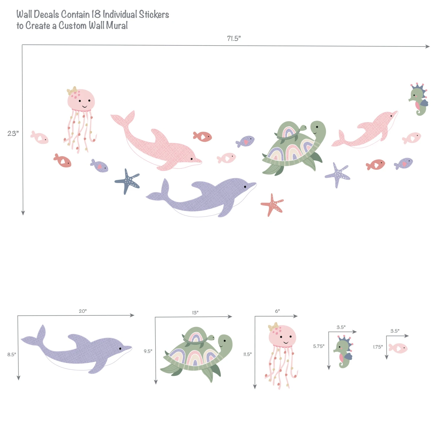 A great way to add a feature wall to your child’s room is with these custom wall decals. There are four sheets that are 12” X 18” each with a total of 18 die-cut pieces. There are three dolphins, mommy, and baby sea turtles, one pink jellyfish, one seahorse, starfish, and a school of tropical fish. These work best on smooth walls. SKU: 734048, UPC: 084122016835.
