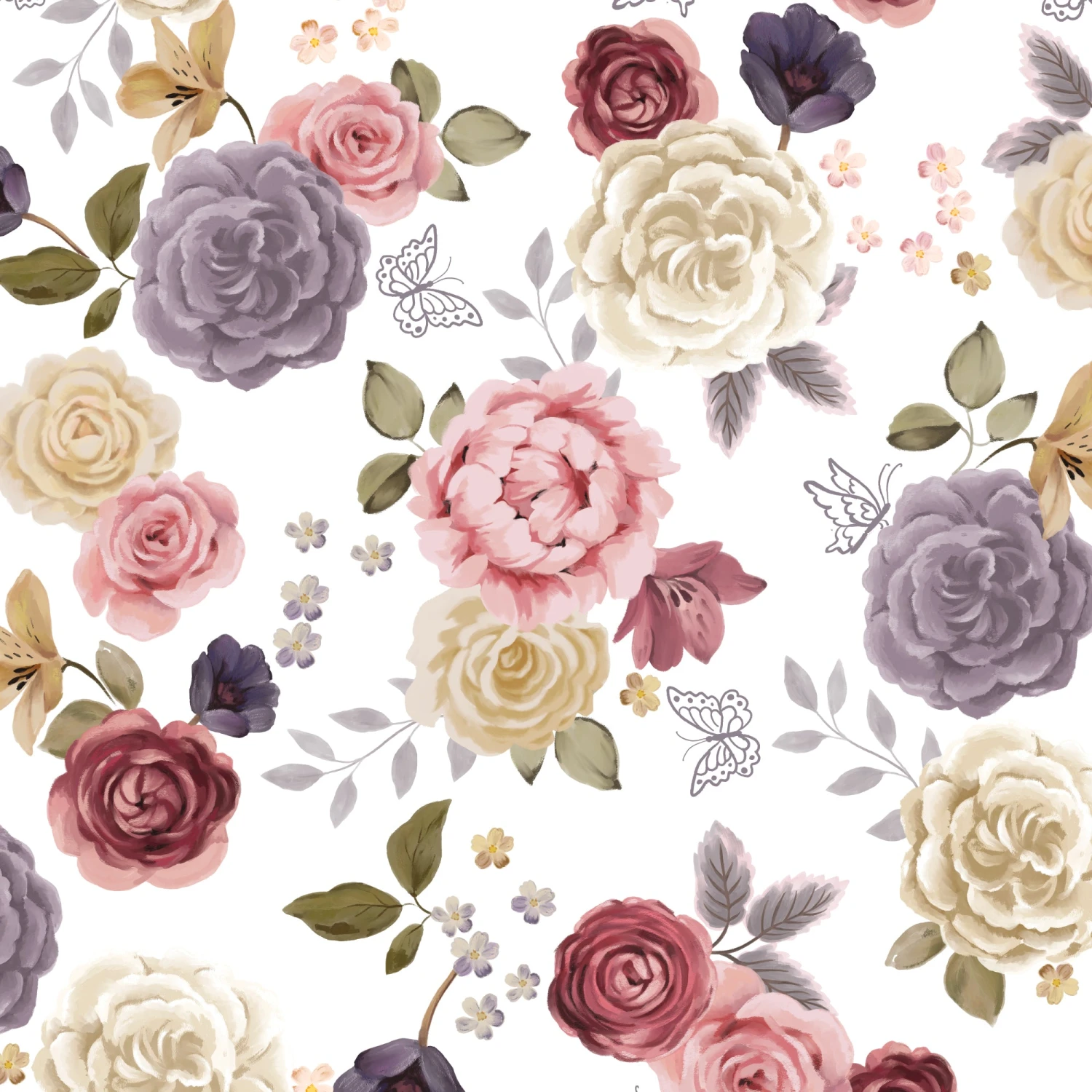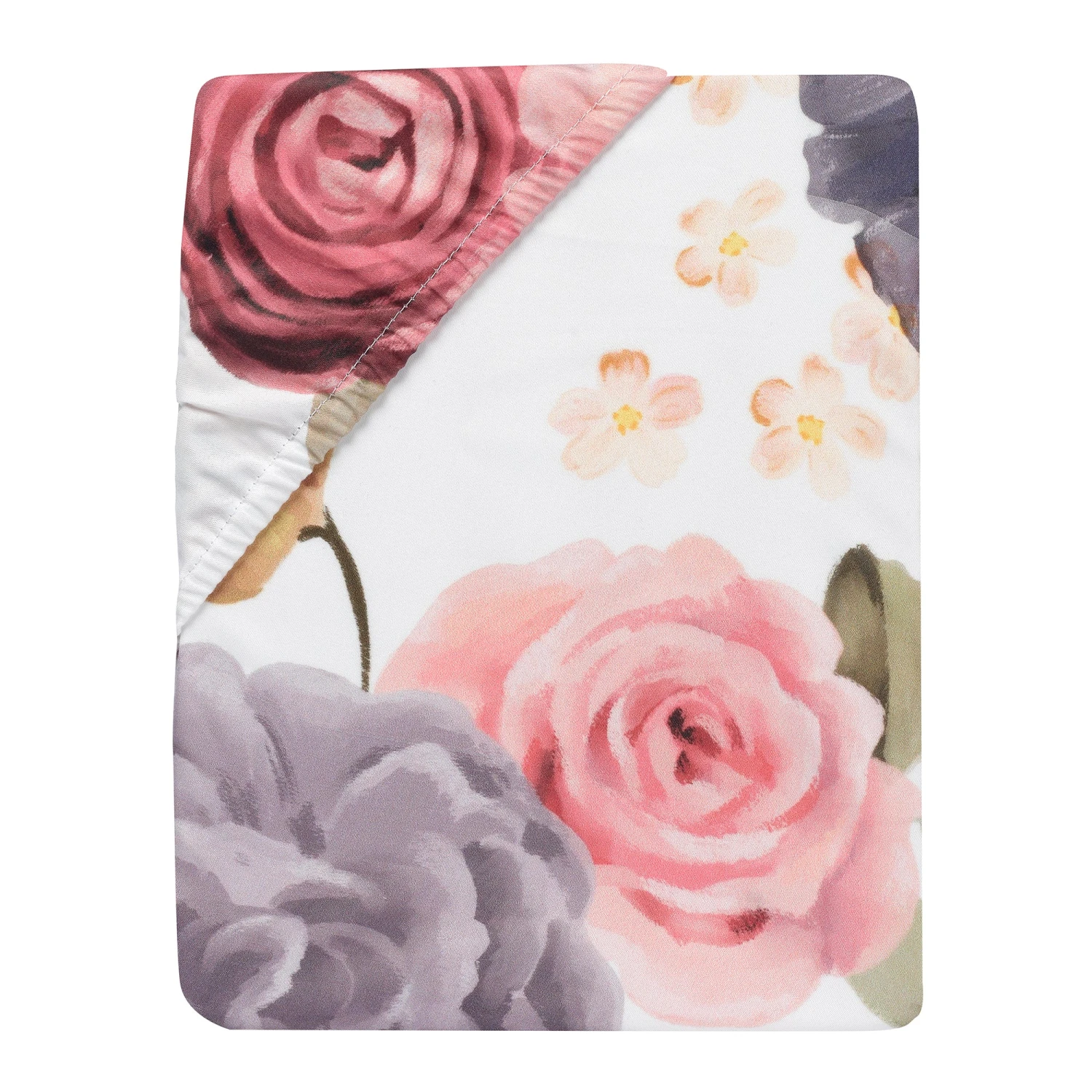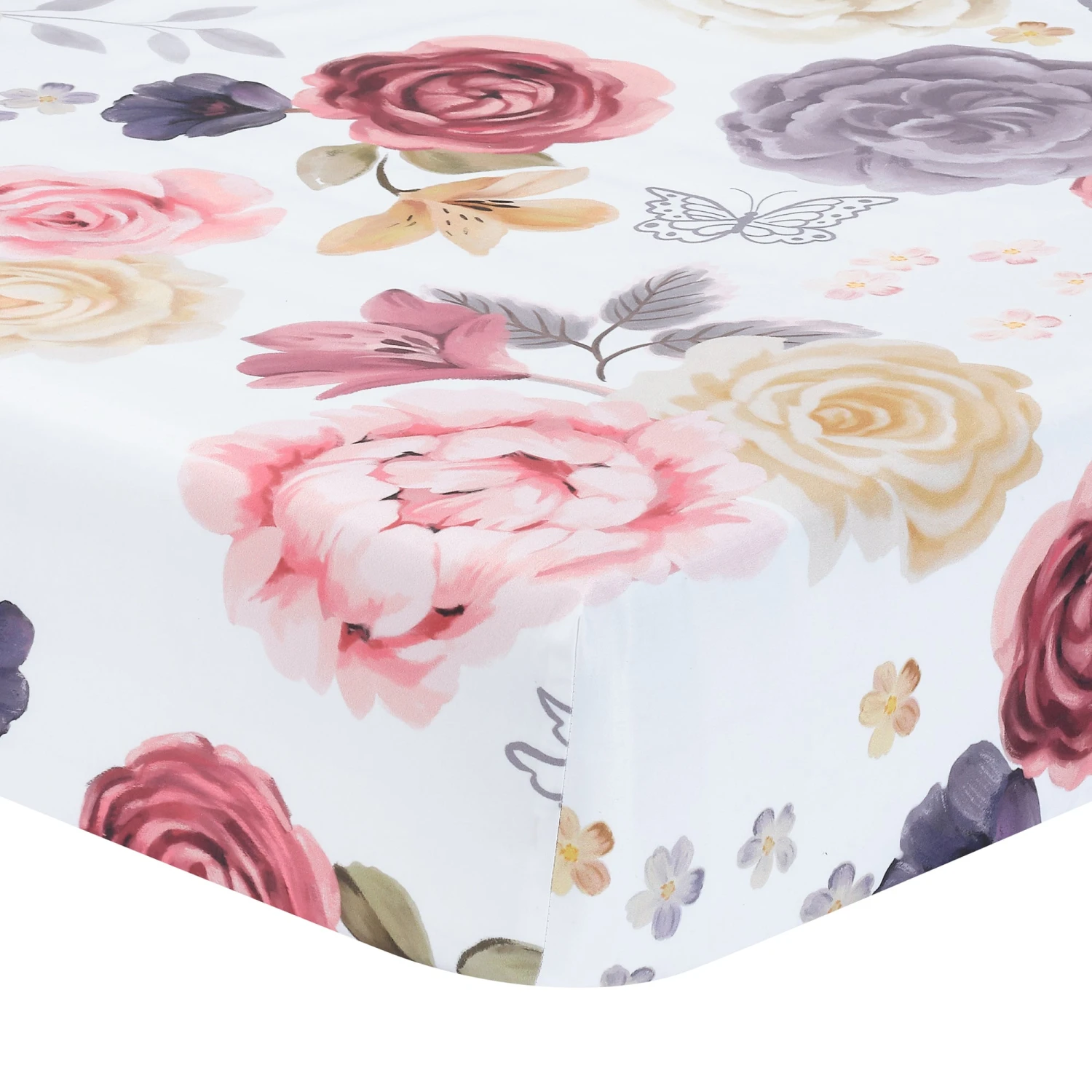 This breathable 100% cotton fitted crib sheet is a creamy white that is decorated with peonies, roses, cherry blossoms, and butterflies in vibrant colors of rose, crimson, pink, lavender, and champagne. It has elastic all the way around ensuring a safe and secure fit on a standard size crib mattress measuring 28 inches by 52 inches. The extensive tone work and layers of colors create this amazing floral design. SKU: 654006B, UPC: 084122017764.