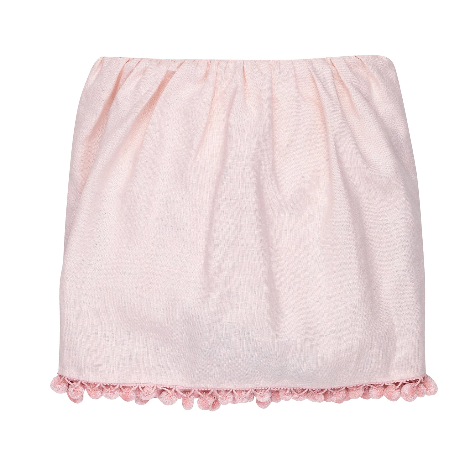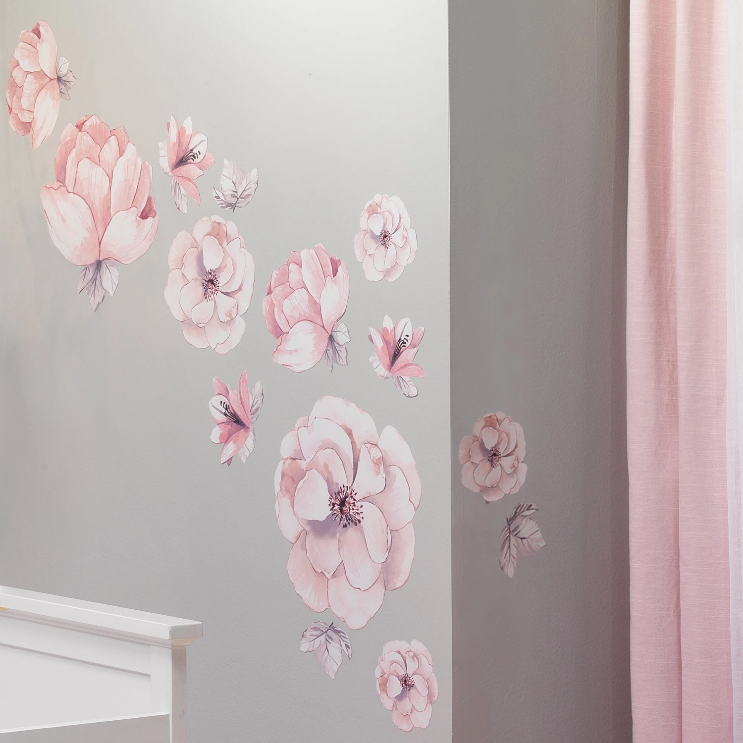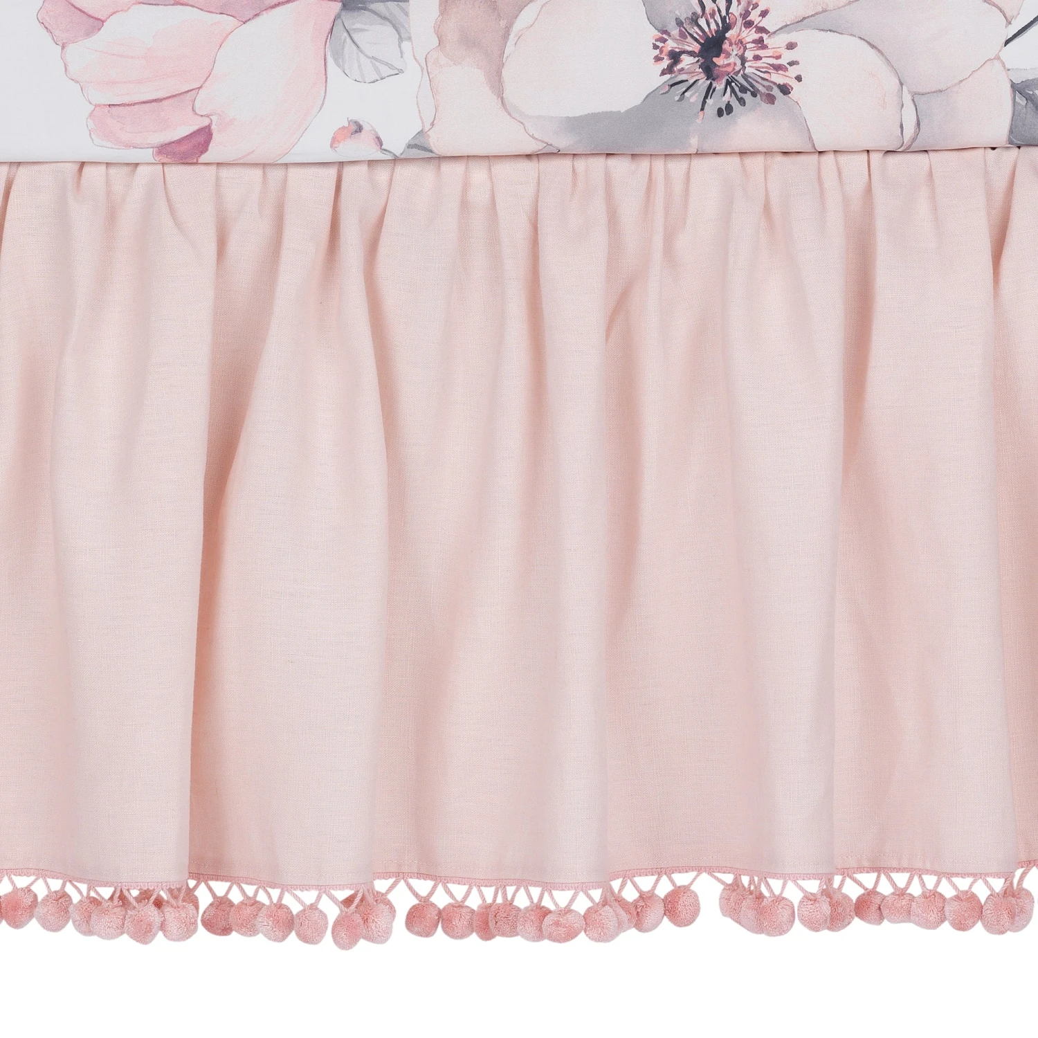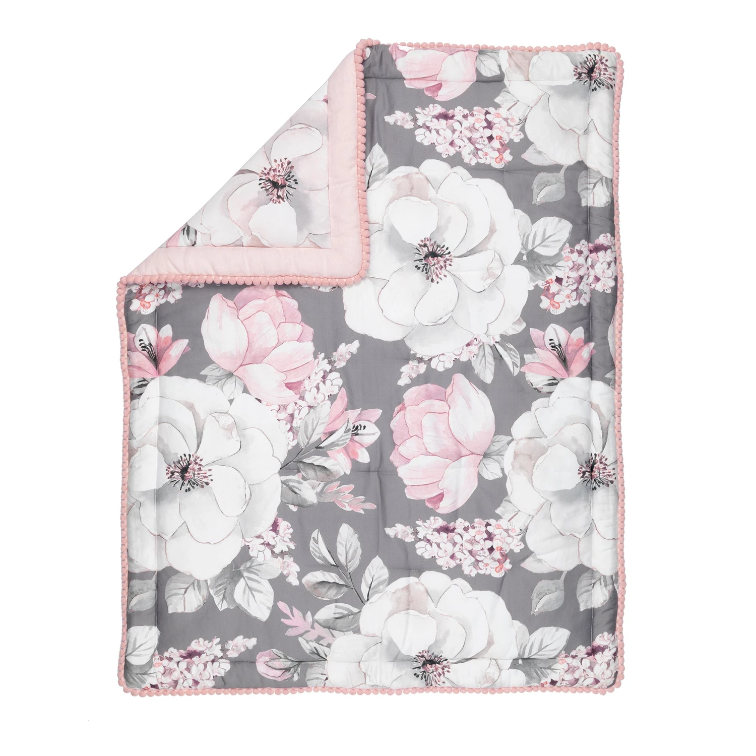 This beautiful reversible floral themed baby bedding nursery set comes complete with a quilt, 100% cotton fitted crib sheet, pom pom trimmed crib skirt and a complete set of wall decals. These gorgeous blossoming flowers are in shades of soft pink with gray accents. It looks like an exquisite watercolor painting and has a border of a linen rayon blend. Pretty pink pom poms decorate the entire quilt and the reverse side is a gray ground with all the pretty coordinating flowers. The 100% cotton fitted crib sheet matches back to the front of this lovely quilt. A 16” long crib skirt in a lovely shade of pink linen and rayon includes the pom pom trim and finishes off the crib in complete luxury. Add to that a set of beautifully toned large wall decals which add a designer touch to the nursery. Please note: set includes one set of wall decals which contains 7 flowers and 2 bunches of leaves; nursery photo is shown with more than one set of wall decals as additional sets are available separately. SKU: 663004V, UPC: 084122010444.