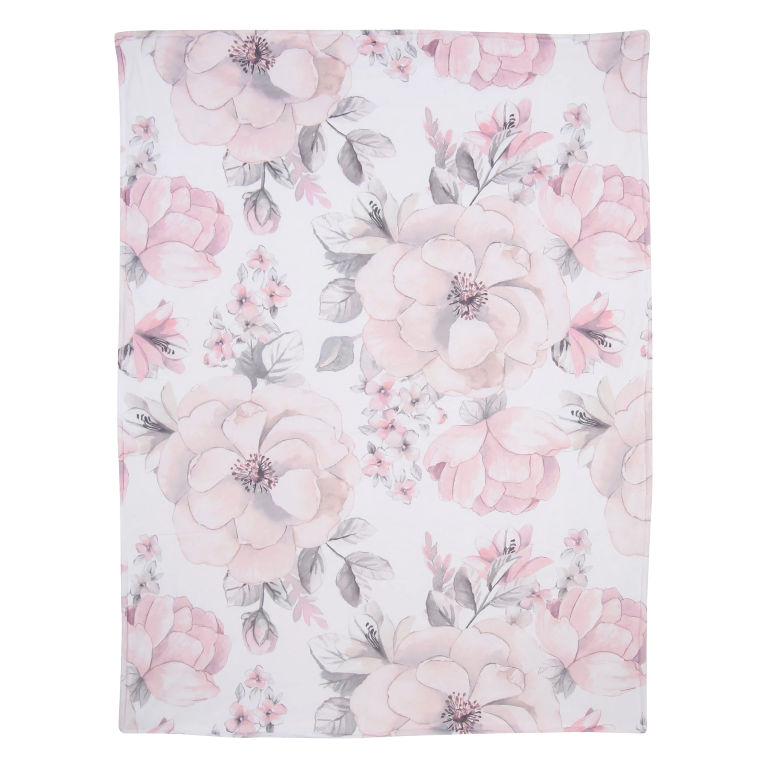 This lovely minky front faux shearling back fleece baby blanket will wrap your little one in total luxury. Pretty pink and gray watercolor flowers decorate the front, and the back is a soft to the touch white faux shearling. Sized at 30” X 40” it is the perfect stroller blanket. It is ideal for trips to the park, running errands, and is great for moms and little ones on the go. It is machine washable for easy care. SKU: 663034SH, UPC: 084122014275.