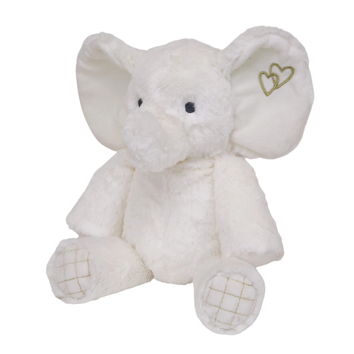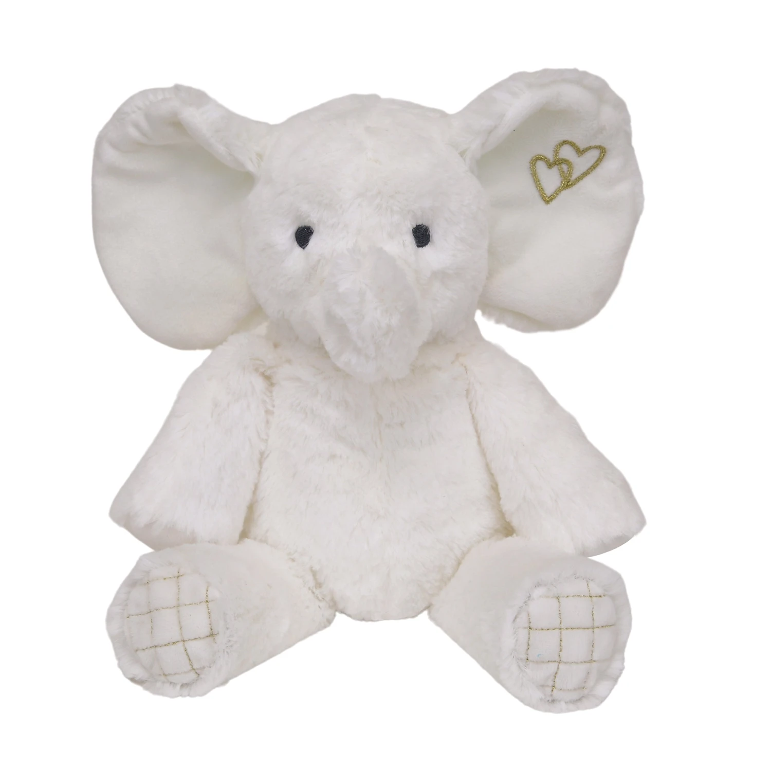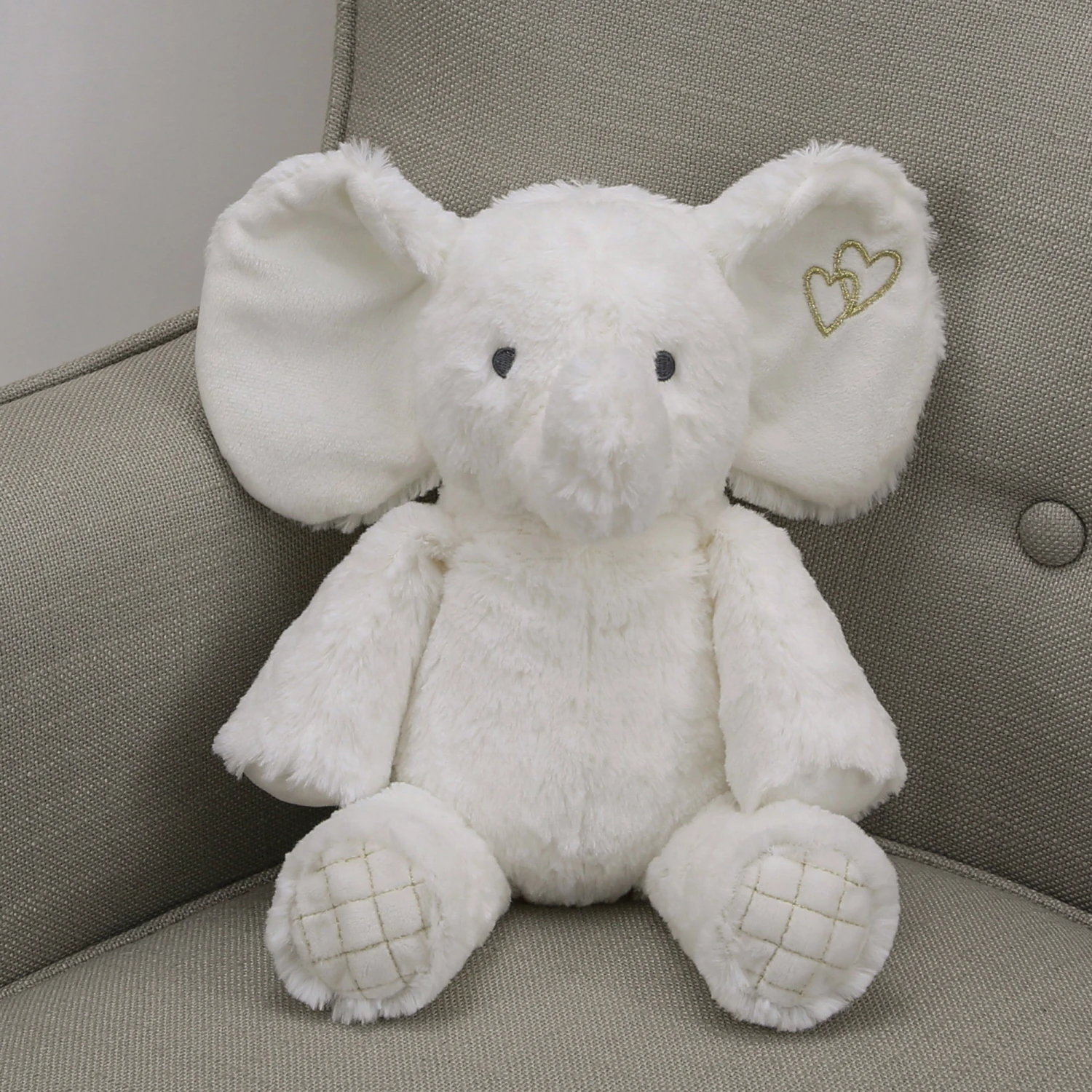 Marshmallow, the friendliest elephant is oh so soft and measures 12.5″ in total length. She is made in a minky faux fur, has gold silhouette hearts embroidered on her ear and her back paws have beautiful gold embroidery. She is sure to be baby’s favorite. SKU: 712043E, UPC: 084122712430.
