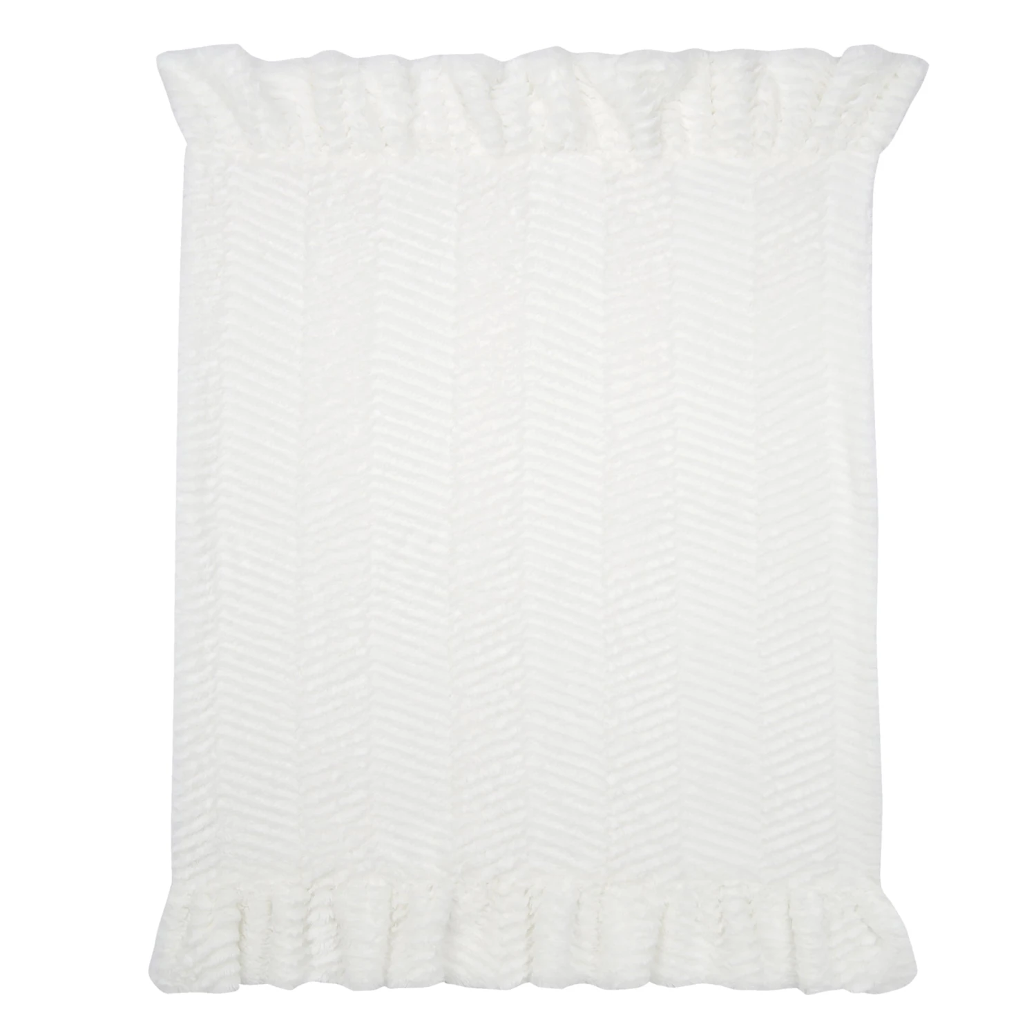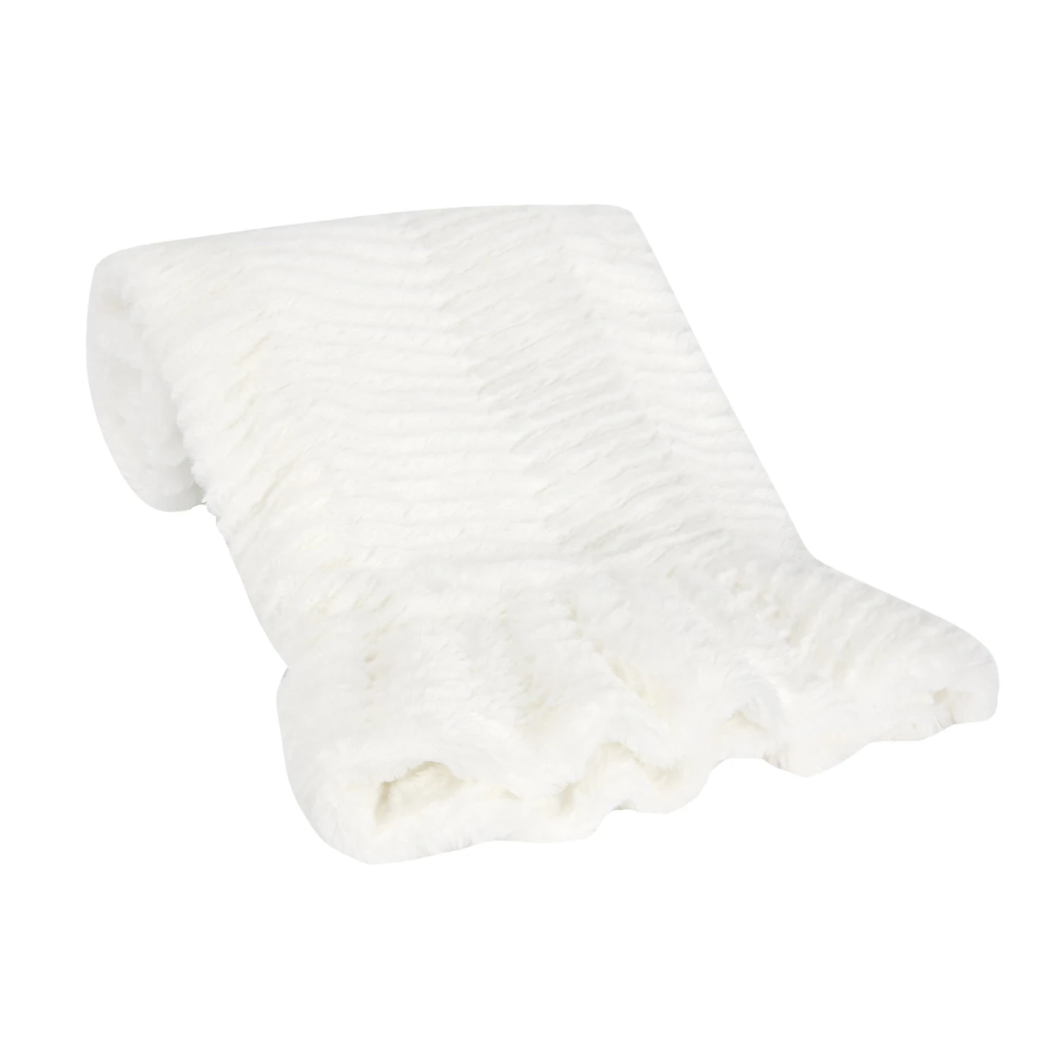 This custom high pile minky blanket has been cut into a lovely chevron white on white pattern. There is a stunning 4 ½” ruffle at the top and bottom of the blanket. The back is a poly/cotton white jersey. This luxurious blanket is 30” X 40” and the ultra-soft material will provide your little one with cozy comfort. SKU: 714034R, UPC: 084122010130.