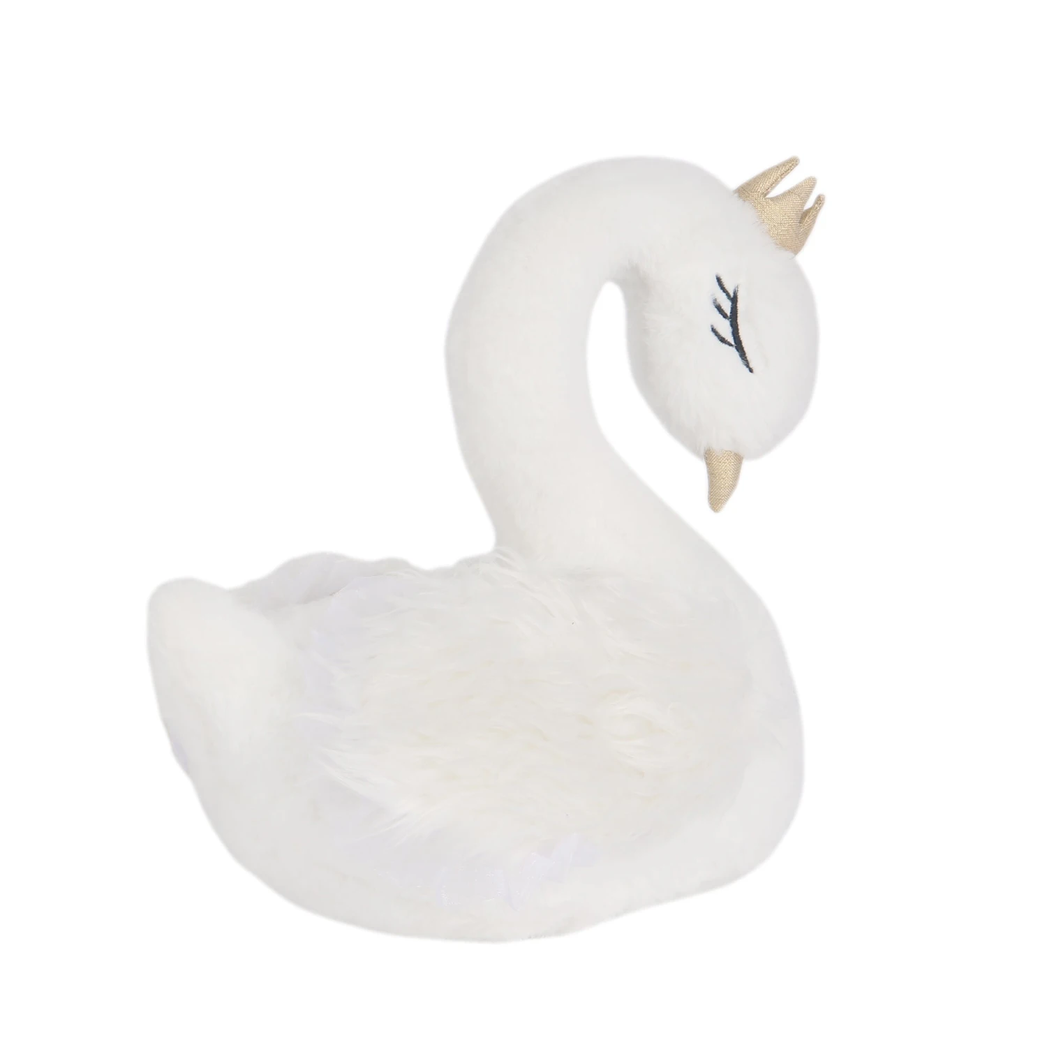This lovely Princess swan is made in a soft white faux fur. She has a woven jacquard crown and beak. She is 10.5” tall and 10.5” long. Her wings have an extra long textured fur and shirred organza tulle around the edge. She has embroidered eyes and eyelashes making her 100% baby safe. She is sure to be your baby’s favorite plush. Princess makes a great baby registry addition, baby shower or welcome home baby gift. SKU: 687043S, UPC: 084122010567.