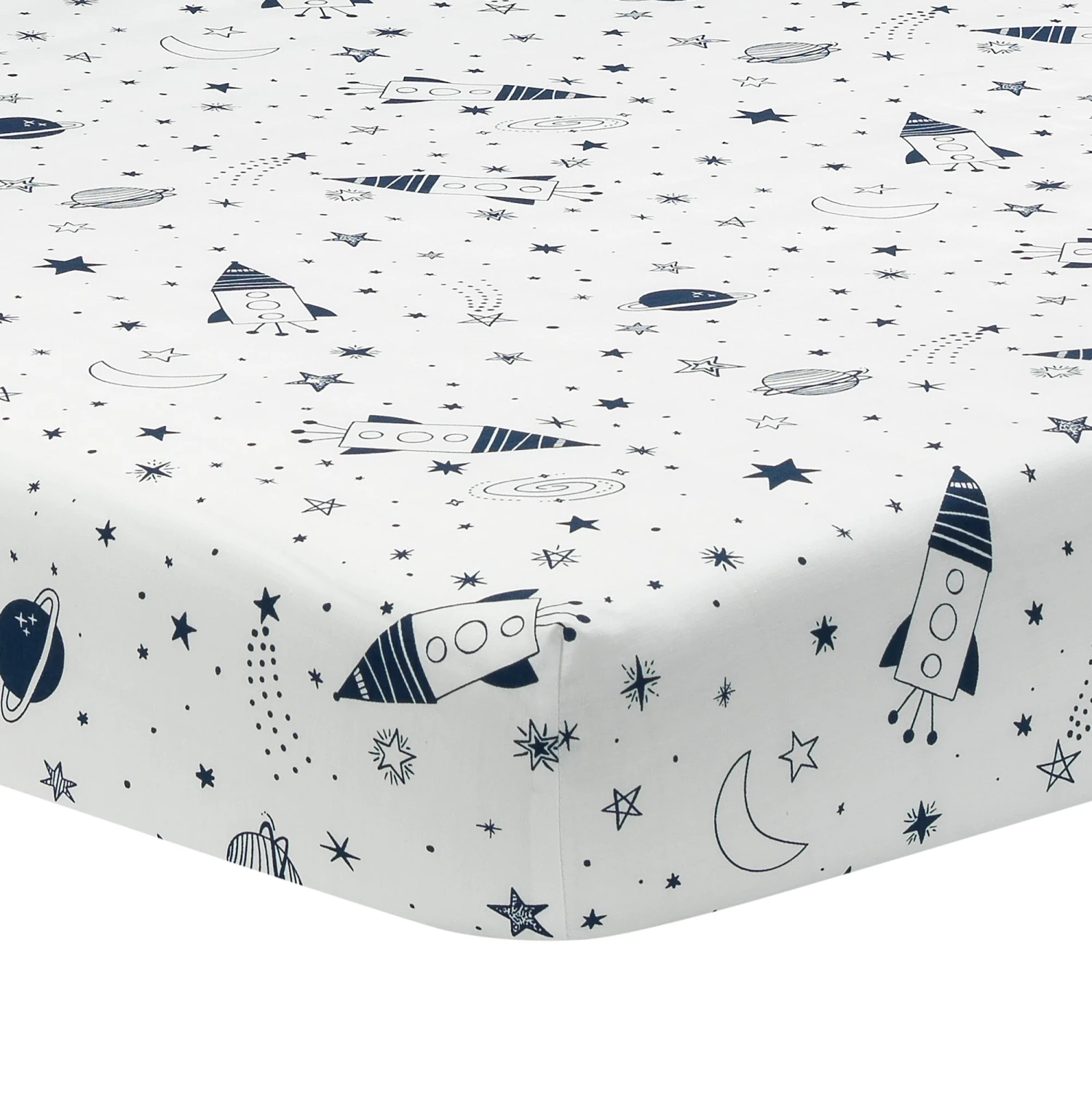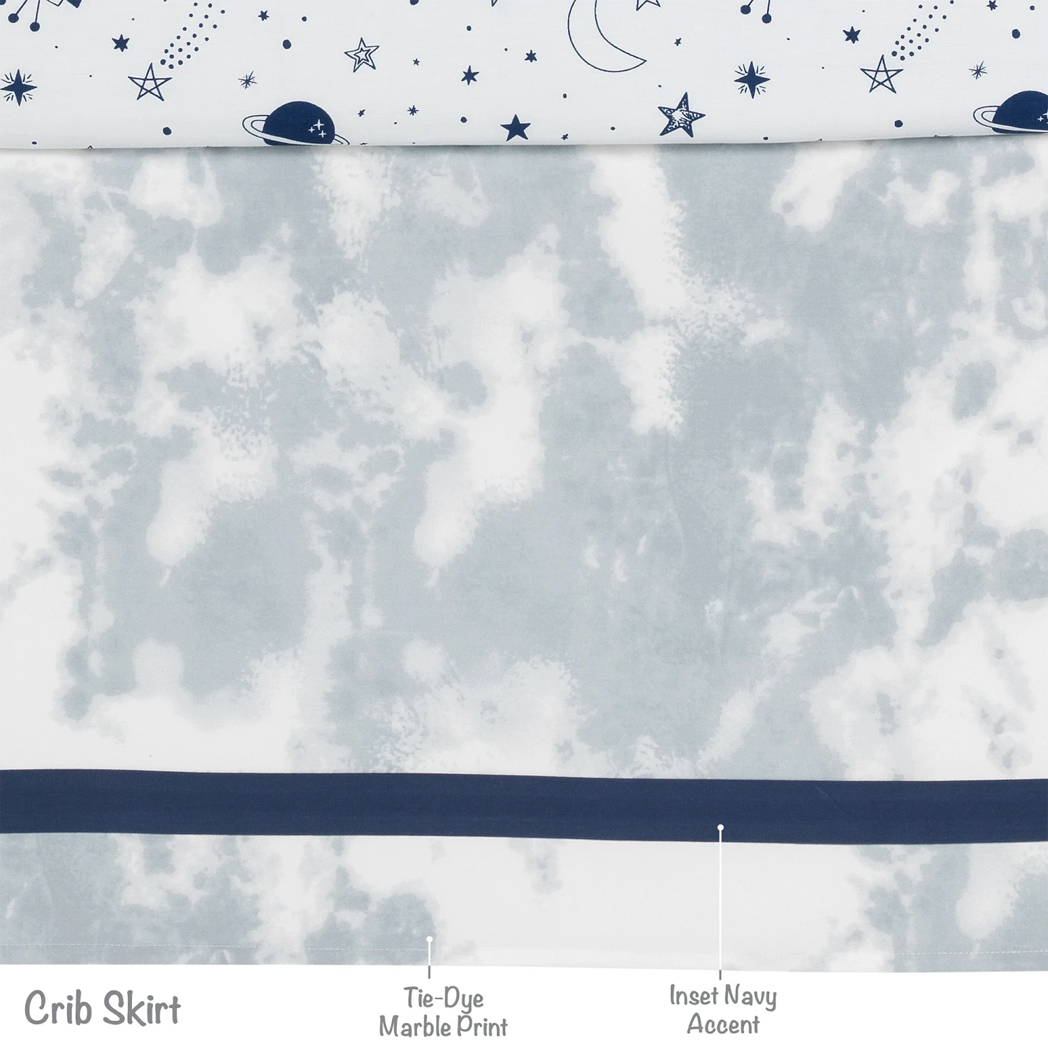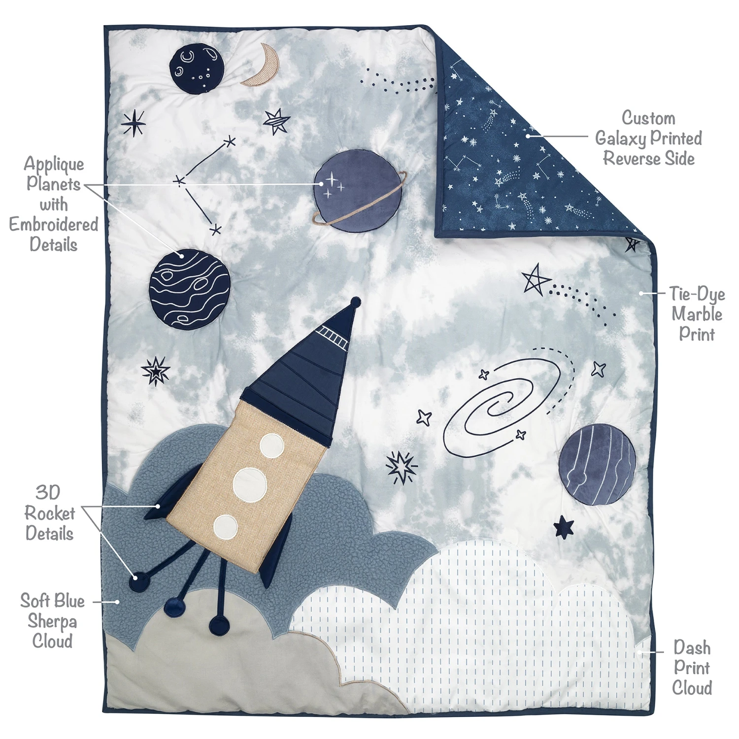 Your little one will love exploring the moon, planets, and stars with this out of the world nursery crib baby bedding collection. Included in the set is one quilt, one breathable 100% cotton fitted crib sheets, one crib skirt, one changing pad cover and a complete set of wall decals. The background was designed in a space age tie-dye/shibori and features a 19” long appliqued rocket ship made in textured fabrics including a soft and cozy dusty blue fleece, minky, twill, a textured linen blend, and lots of embroideries. The back of the quilt is printed with a star constellation on a navy ground. The breathable 100% cotton fitted crib sheet features rockets, stars and moons tossed over a white ground. The crib sheet has elastic all the way around to ensure a safe and secure fit on a standard-sized mattress measuring 52″ x 28″. The crib skirt is a futuristic tie-dye/shibori design that looks like clouds. There is a 1” wide navy twill border and the skirt is 14 ½” long. It is made in a soft cotton-poly twill. The changing pad cover is sized at 16” X 32”. The center panel is navy blue fleece, and the side panels are a galaxy print. There is elastic on the two short sides and summaryholes for the safety straps so your little one is safe and secure while having their diaper changed. There is a complete set of wall decals included in this set. There are four sheets that are 12”X18” each and a total of 32 die-cut pieces. The rocket is 17 ½” long. There are stars, a 6” moon, an 8” wide Saturn planet, a 6” Neptune planet and a 4” gray planet along with clouds. These decals are easy to apply to smooth walls and will not harm your walls upon removal. SKU: 892006V, UPC: 084122012950.