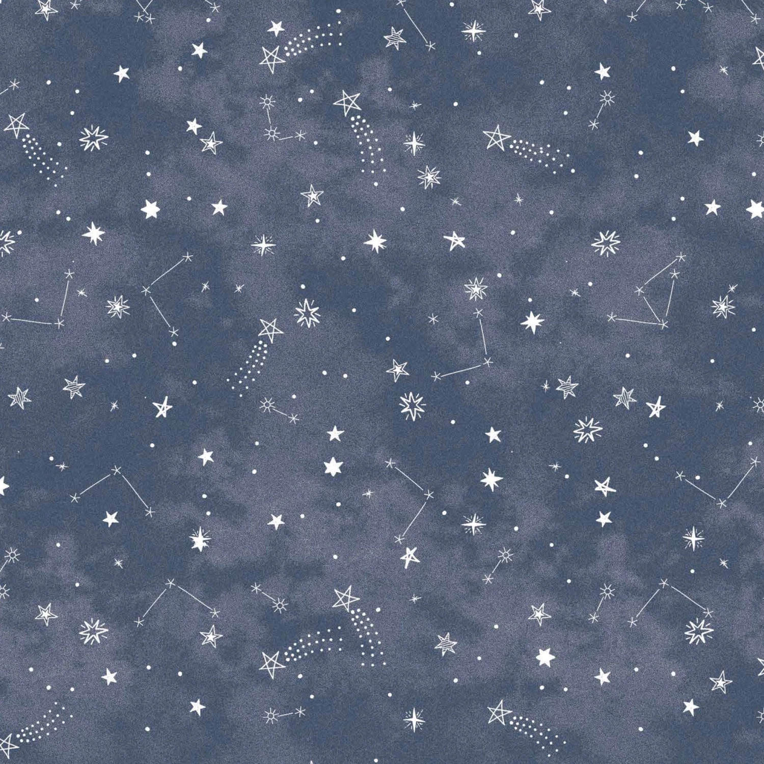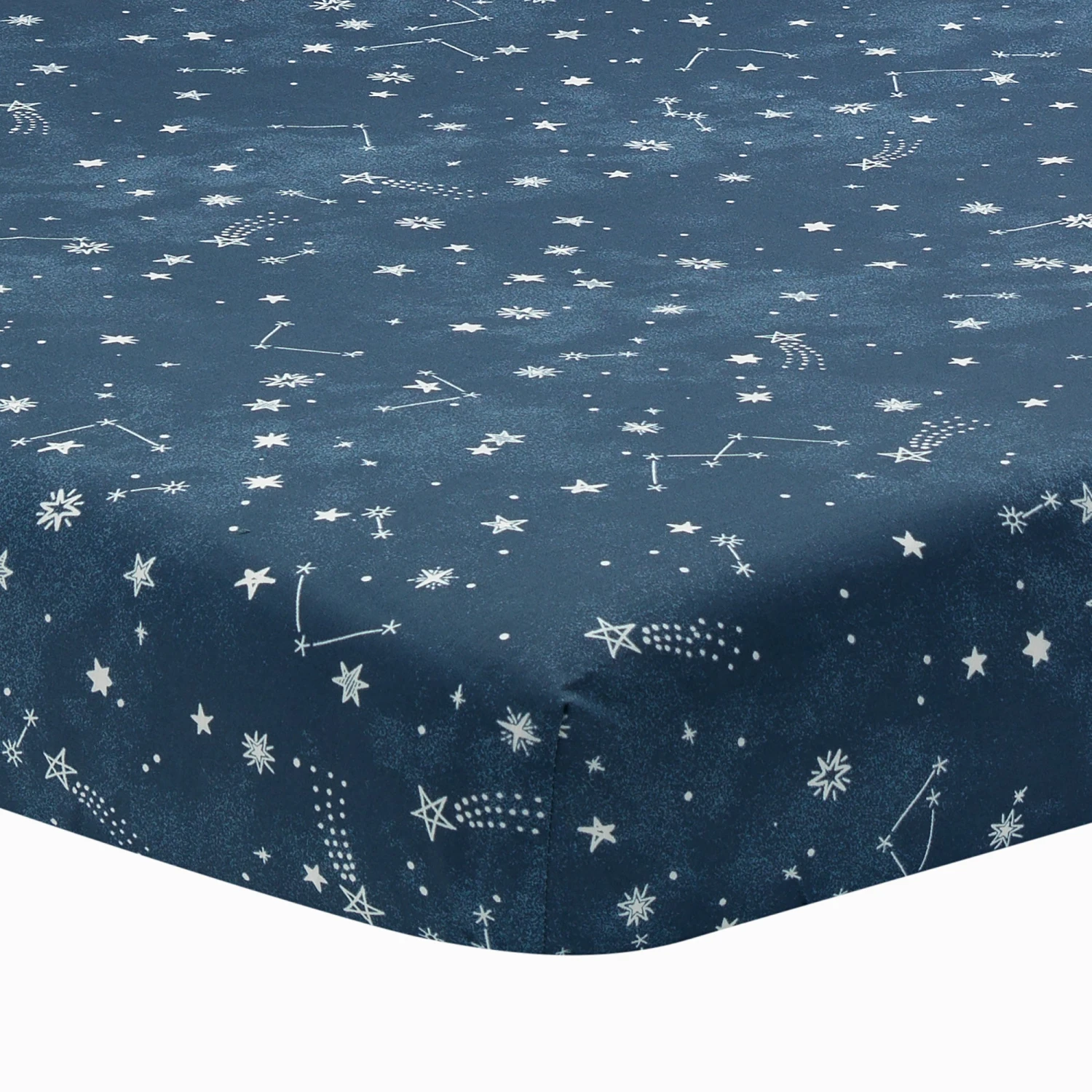 This constellation design breathable 100% cotton fitted crib sheet is on a navy-blue ground. There are hundreds of white stars in different shapes and sizes. This fitted crib sheet has elastic all the way around ensuring a safe and secure fit on a standard size crib/toddler mattress measuring 28” X 52”. This gender-neutral design works well for baby boys and baby girls. SKU: 892006B, UPC: 084122012981.