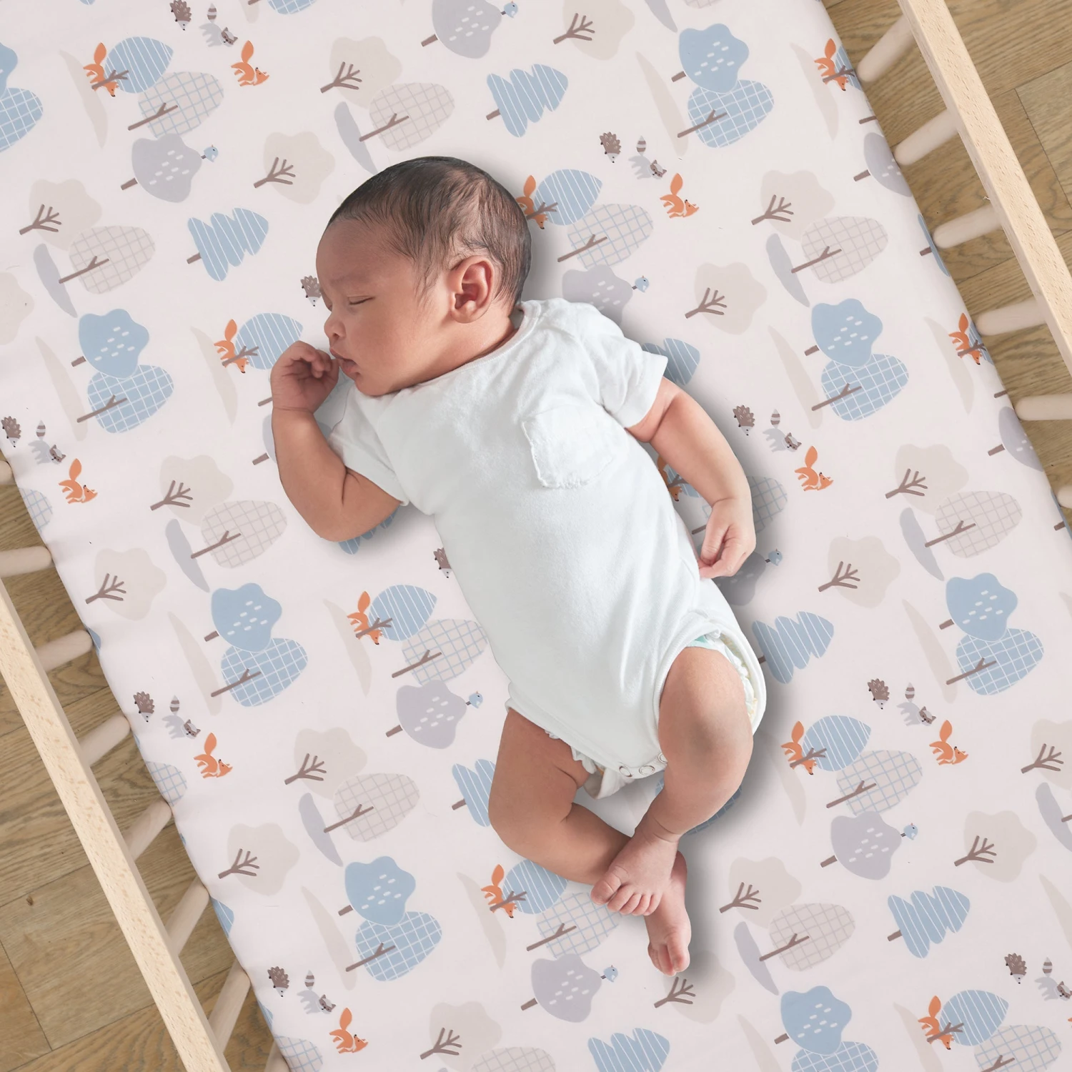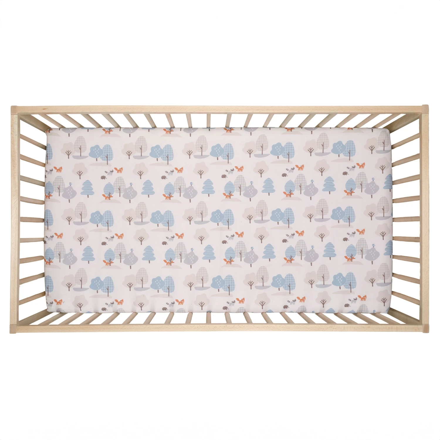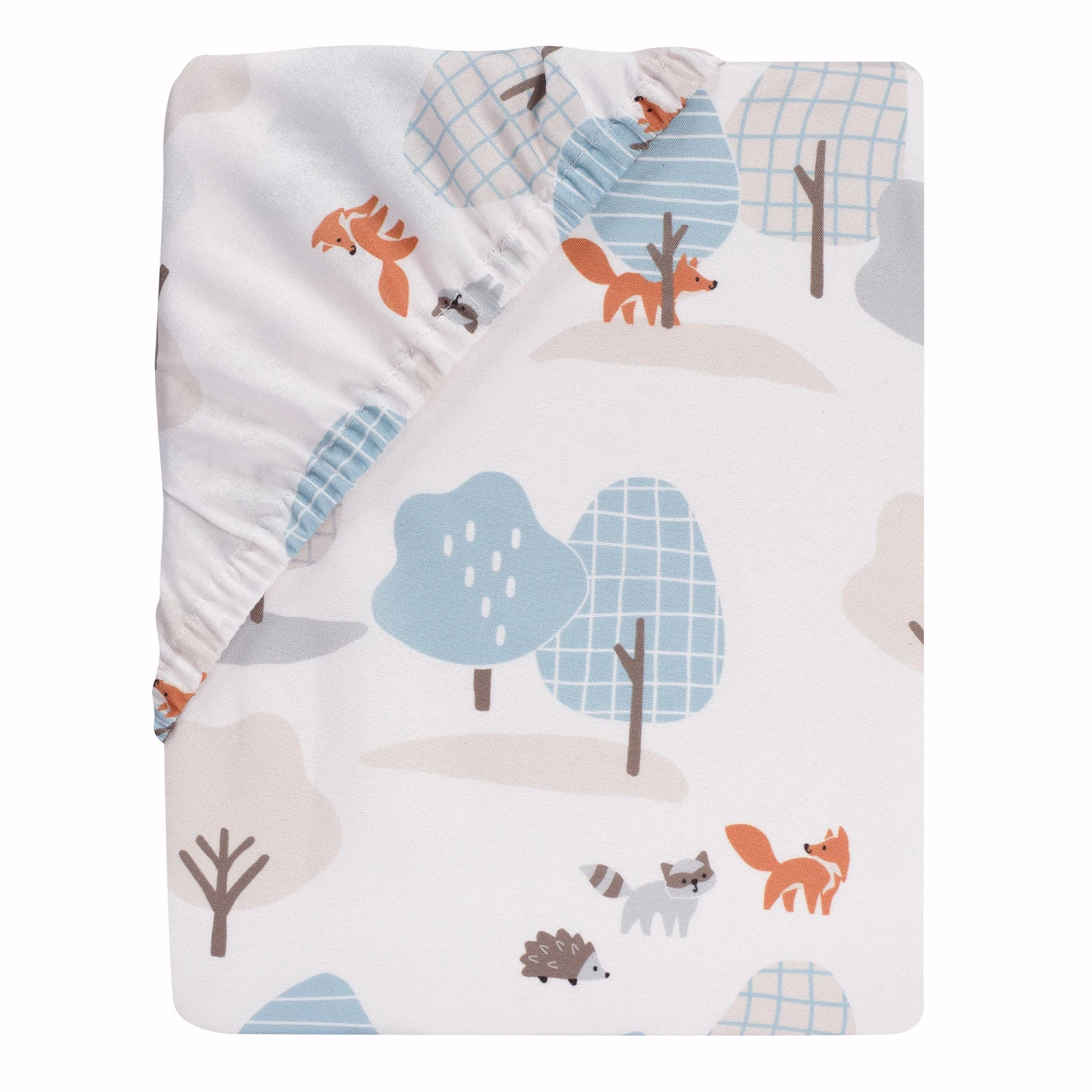 This charming Sleepytime Bear fitted crib sheet is made in a super soft microfiber material that is gentle on your baby’s delicate skin. The sheet is decorated with trees, foxes, raccoons, hedgehogs, and birds. There is elastic all the way around ensuring a safe and secure fit on a standard size crib mattress measuring 28” X 52” SKU: 289006B, UPC: 084122018426.