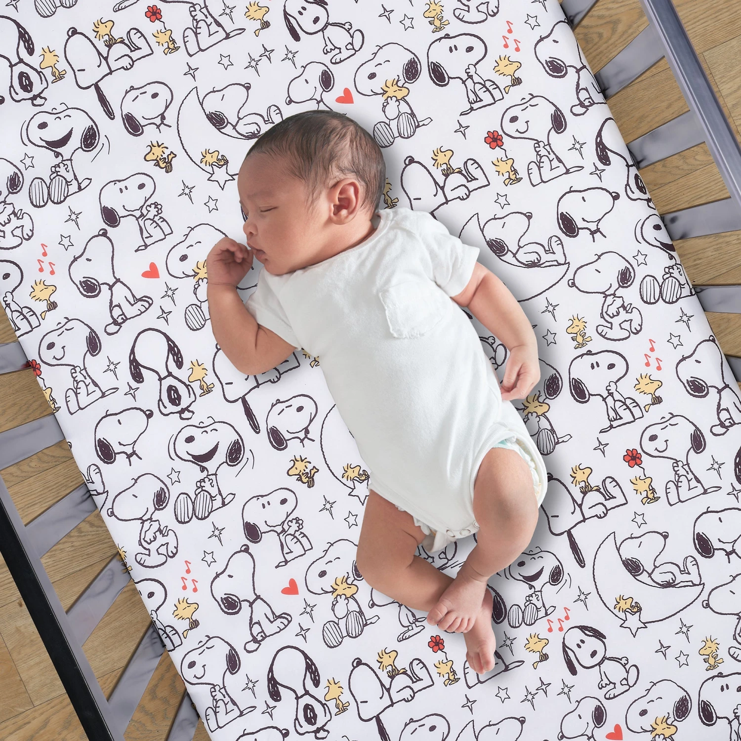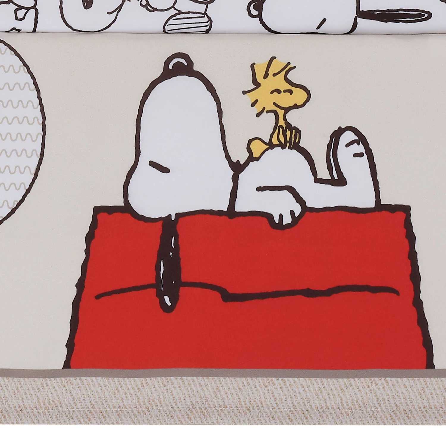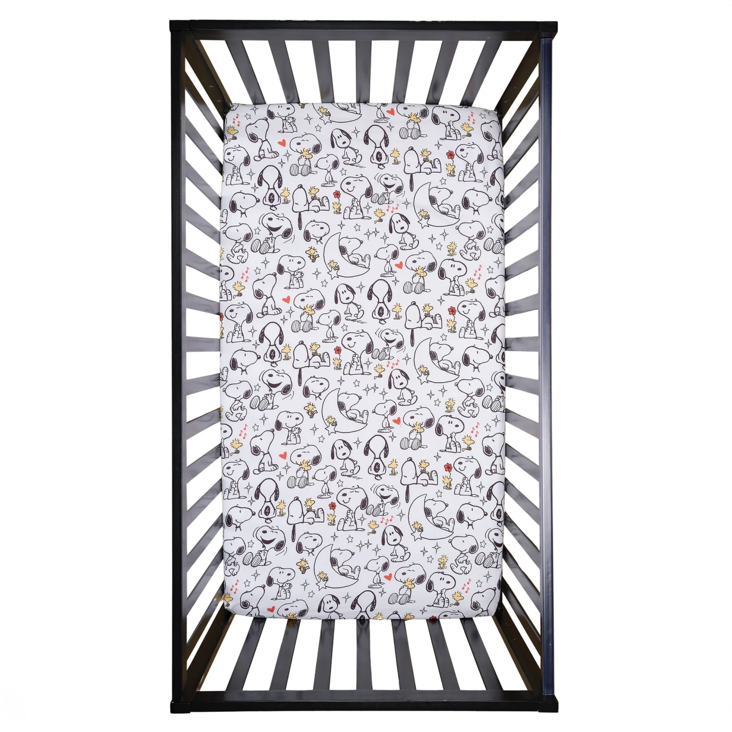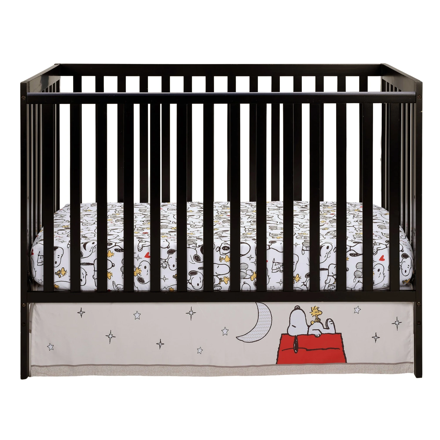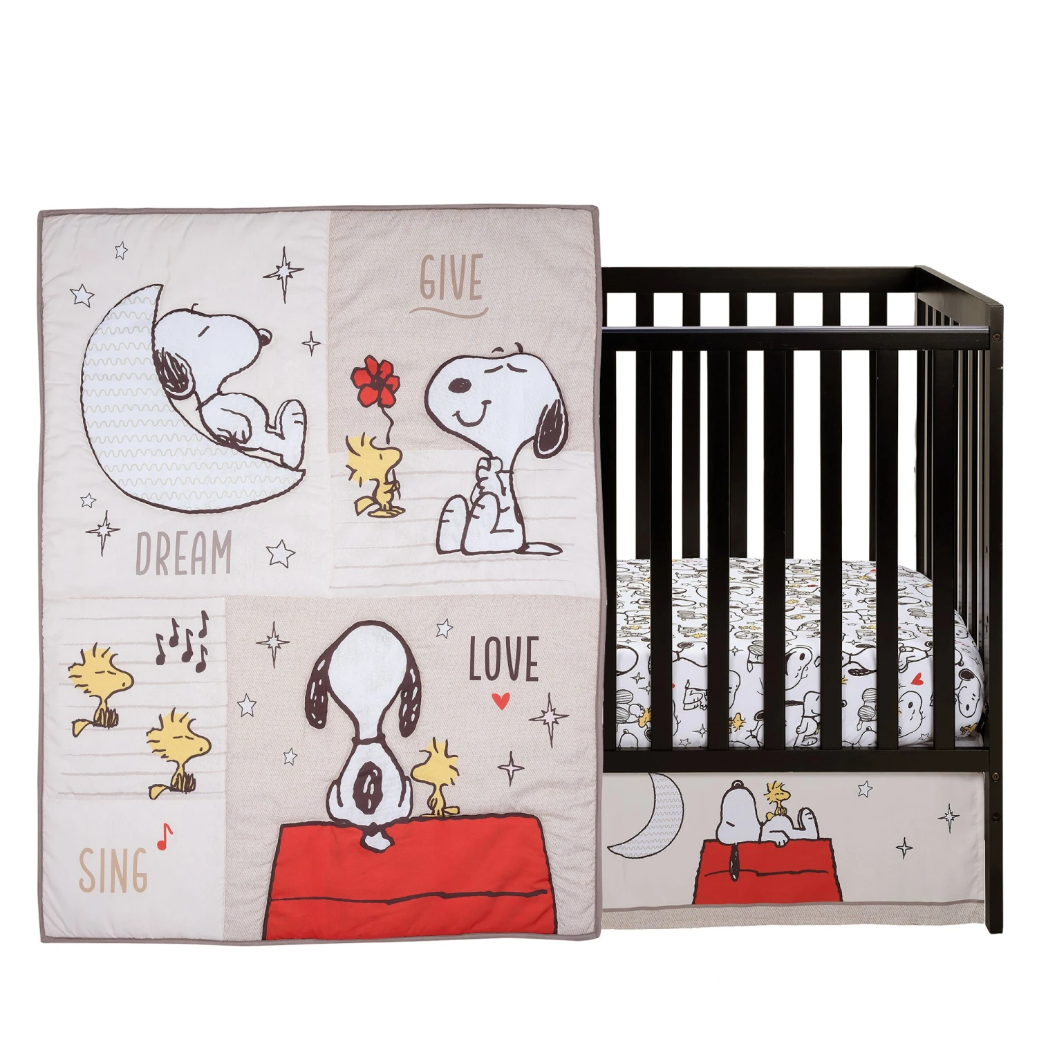 Create a space filled with love and laughter with this ultra-soft 3 piece crib bedding set which includes one quilt, one fitted crib sheet, and one crib skirt. Made in a baby-soft microfiber material that is gentle on your little one’s delicate skin. This whimsical design features Snoopy and Woodstock in adorable poses along with musical notes, the moon and stars, and pops of color. The back of the quilt and the fitted crib sheet are on a white ground with playful Snoopy, and Woodstock in various cute positions. The crib sheet has elastic all the way around ensuring a safe and secure fit on a standard-size crib mattress measuring 28” X 52”. The crib skirt adds the finishing touch to your child’s crib. It features Snoopy taking a nap on his red dog house while Woodstock enjoys sitting on his tummy. They are surrounded by moons and stars. The crib skirt has a 10” drop including a 1” bottom border. SKU: 255003V, UPC: 084122018600.