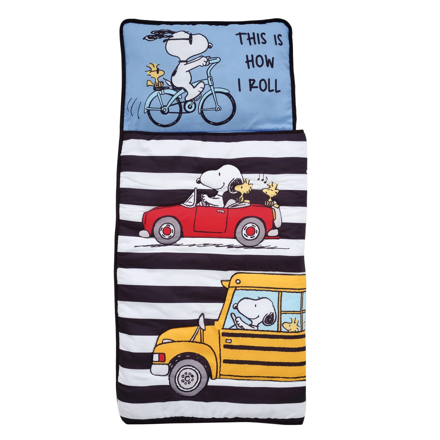 Your child will love this fun, colorful Nap Mat featuring Snoopy and Woodstock on the go. Perfect for toddlers at preschool and daycare. It is made with soft polyester microfiber and expertly crafted with a built-in pillow. Snoopy loves riding in his red convertible, his yellow school bus, and his blue bicycle. Of course, Woodstock is his number one travel buddy. Its travel ready design easily rolls up and is secure for easy care. SKU: 621058SN, UPC: 084122019966.