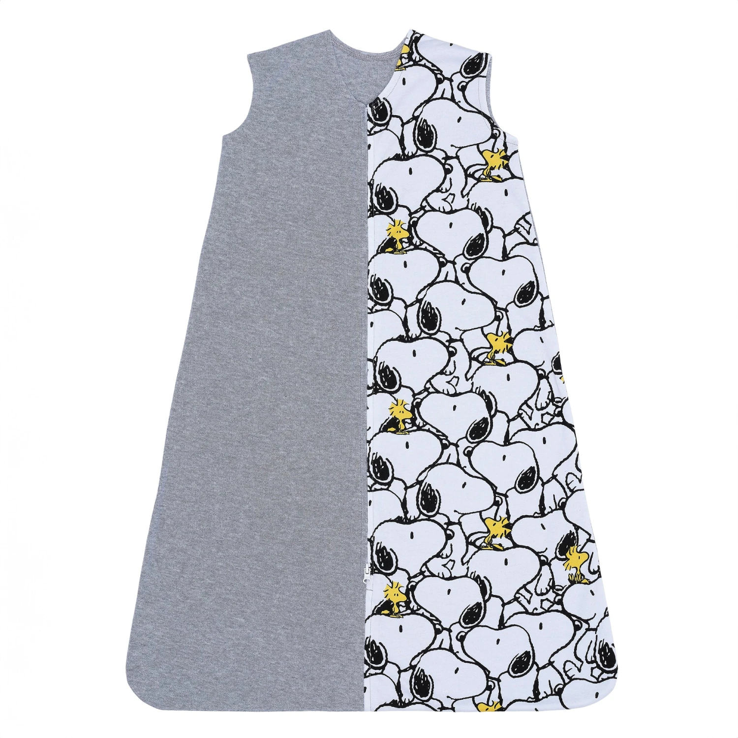 Keep your little one warm, cozy, and stylish in this adorable Snoopy and Woodstock breathable cotton jersey wearable blanket. This comfy sleepsack is more than a blanket; it is a wearable hug that lets your baby move and explore while staying perfectly cozy. Made in 100% cotton jersey, it is soft and breathable and is delicate on baby’s sensitive skin. The right side features multiple Snoopys in a trendy sketch style with little yellow Woodstocks adding to the charm. The left side and back is a heather gray cotton jersey and the 20” long zipper is concealed by a placket. SKU: 771034W, UPC: 084122018402.