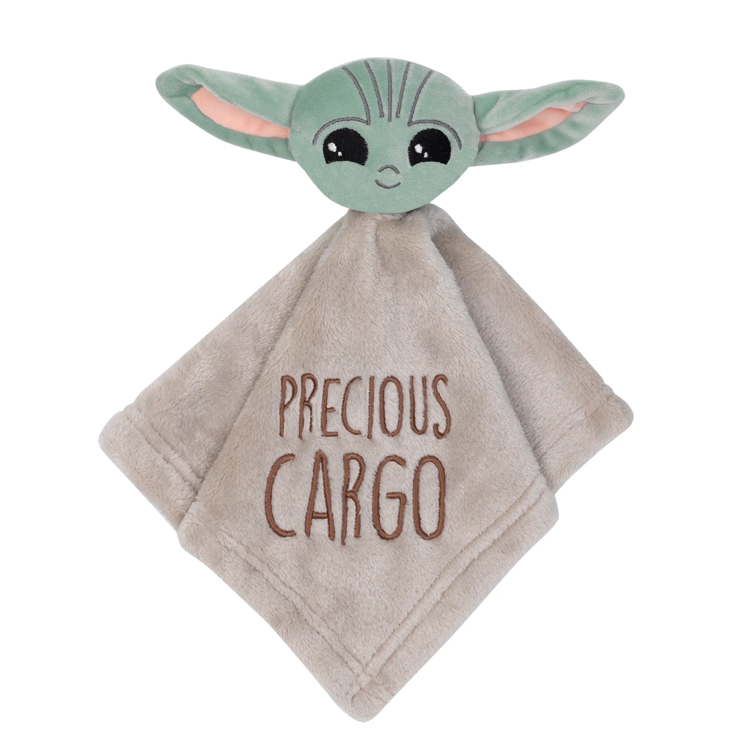 Star Wars The Mandalorian Grogu aka The Child or Baby Yoda cotton wearable blanket & lovey gift set makes the perfect baby shower gift or welcome home baby gift. Now your baby can harness the jedi powers and cuteness of Grogu when they wear this wearable blanket. This wearable blanket is made of 100% cotton jersey, exclusive of ornamentation. The main front and back is printed in horizontal taupe stripes. The bottom portion of the front is made of solid taupe jersey. The Child applique is approximately 8 ½” tall. His head, face and hands are a dusty green velour. His coat is a light tan velour, and his inner ears are light pink velour. His face is completely embroidered. The center front zipper is 21” in length. Designed to fit a size medium and fits a baby approximately 6 – 12 months or 16 – 24 pounds. The lovey/security blanket is made in a luxurious coral fleece and The Child’s head is made of a soft velour. The lovey is 14” X 14”. His face, outer ears and hands are a dusty green velour, and his inner ears are a light pink velour. His large eyes are embroidered in black. All other features are embroidered in a dark gray thread. The message “Precious Cargo” is embroidered on the front center of the lovey. SKU: 871302V, UPC: 084122012349.