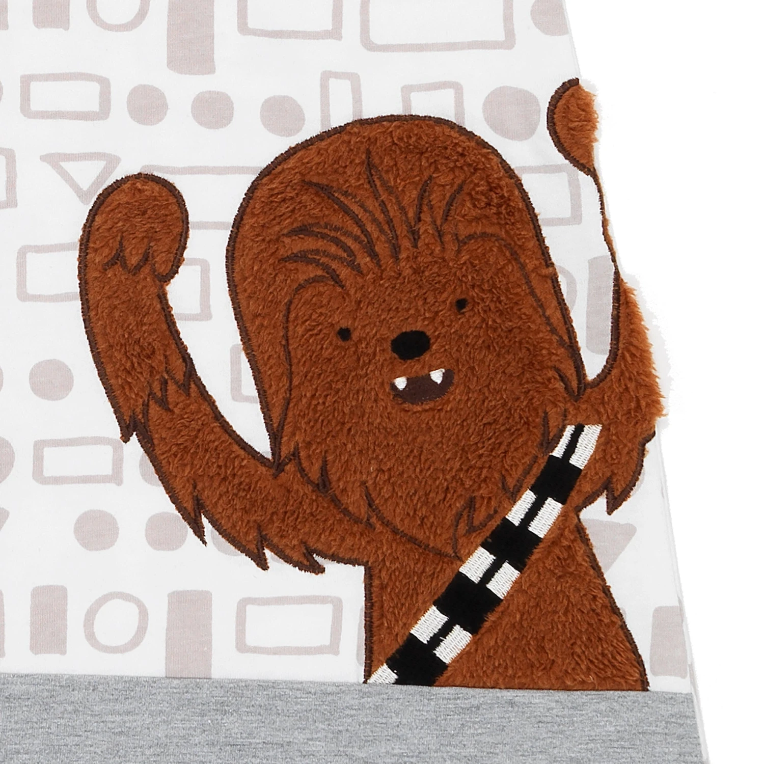 Your little one will love cuddling with this cozy wearable blanket and hugging this oh so soft Chewbacca lovey/security blanket. Also known as Chewie, this loveable, loyal, Star Wars Navigator is one of the most famous characters. The upper portion of this wearable blanket is cotton jersey with printed geo shapes in a warm taupe color. The bottom portion on the front is made of a cotton rich light heather gray jersey. Chewbacca is appliqued on the right side in a furry minky. He is approximately 8” tall and has his black and white bandolier embroidered across his body. His entire face is embroidered. The center zipper is 21” in length. This medium size fits a baby 6 – 12 months or 16 – 24 pounds. The lovey/security blanket is a luxurious coral fleece and Chewbacca’s head is made in a soft furry minky. The lovey is 14” X 14”. His eyes, nose, mouth, and teeth are embroidered. The message “Stay Wild” is embroidered on the front of the lovey. It makes a great baby shower gift or welcome home baby gift. SKU: 871202V, UPC: 084122012332.