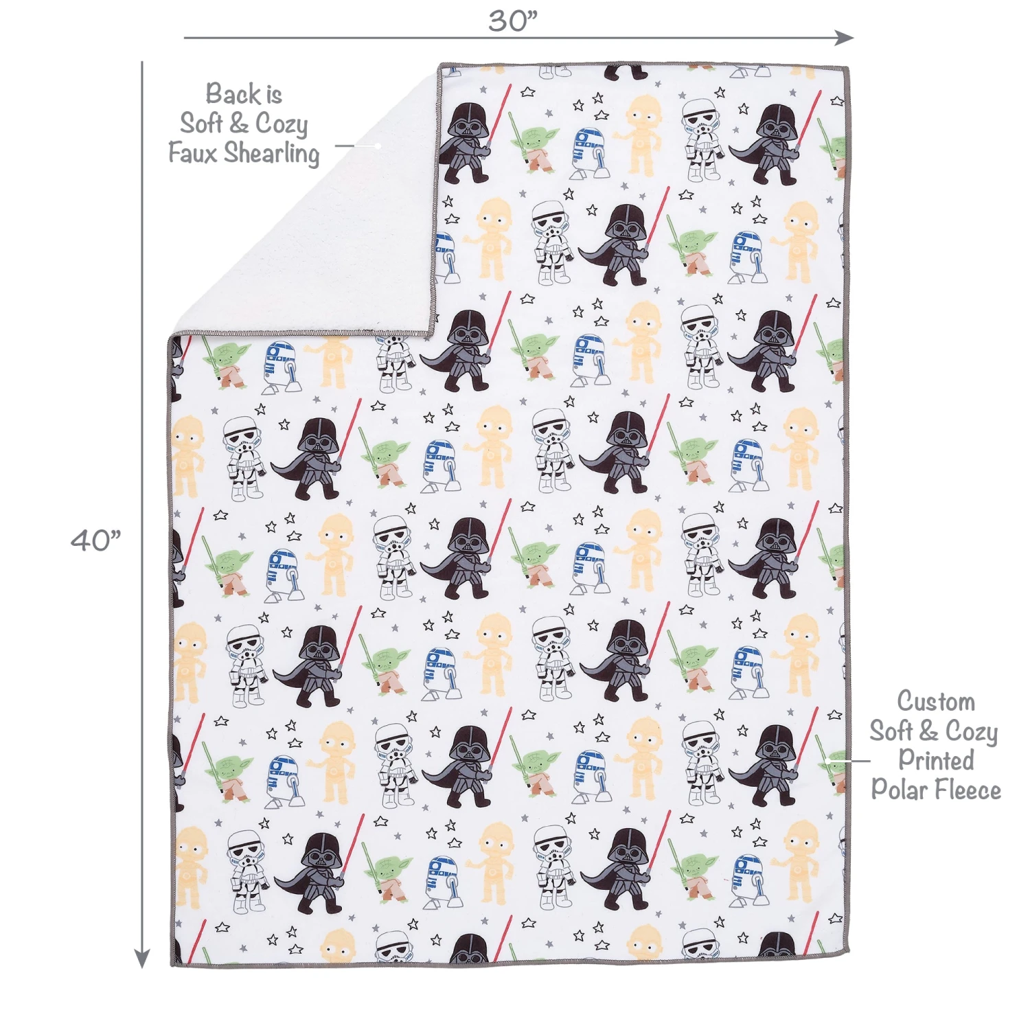 Your little one will love to cuddle up in this soft and cozy Star Wars Classic baby blanket. Your favorite Star Wars characters (Yoda, Darth Vader, R2-D2, C-3PO, and a storm trooper) decorate the front which is a soft fleece, and the back is a furry white cozy faux shearling. Sized at 30” X 40” making it a great stroller blanket. It is ideal for trips to the park, running errands and is perfect for moms, dads, and babies on the go. It makes an amazing baby shower gift or welcome home baby gift. SKU: 872134, UPC: 084122015722.