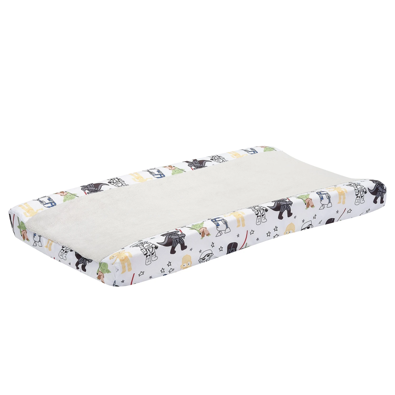 A soft, luxurious gray fleece center is perfect for changing your little padiwan (Jedi-in-training). The side panels are a soft microfiber fabric featuring your favorite Star Wars characters. There are summaryholes for the changing pad straps so your little one is safe and secure while getting their diaper changes. There is elastic on the short sides in order to fit securely on a standard sized changing pad measuring 32” X 16”. It is machine washable for easy care. SKU: 872150, UPC: 084122015715.