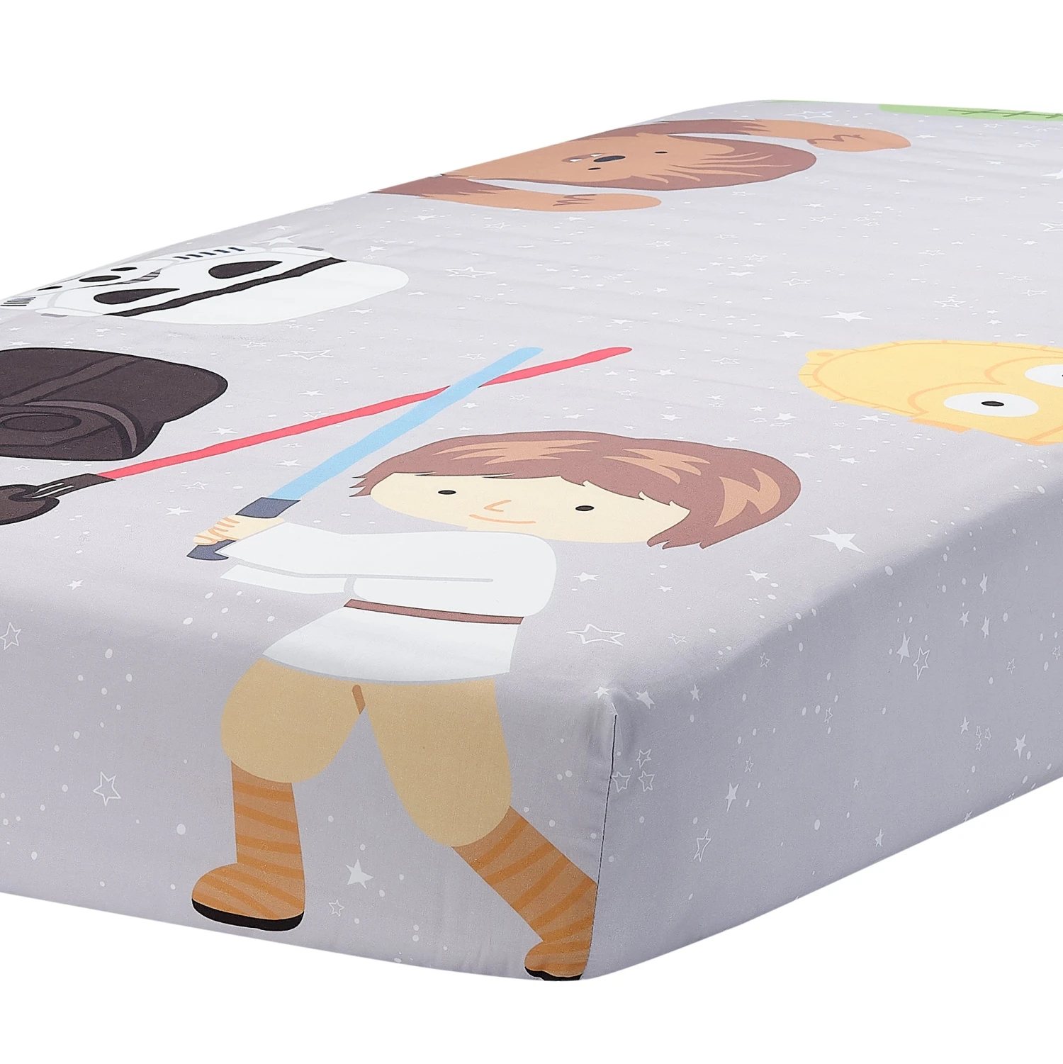 Your little one will rule the Galaxy with this breathable, 100% cotton fitted crib/toddler sheet. This crib sheet includes eight officially licensed Star Wars characters. There is Darth Vader, Luke Skywalker, Princess Leia, Yoda, Chewbacca, a Stormtrooper, C-3PO, and R2D2. Your little Padawan (Jedi-in-training) will fit right in the center of the galaxy for a picture-perfect moment, great for sharing on social media and beyond. The sheet has elastic all the way around ensuring a safe and secure fit on a standard sized crib/toddler mattress measuring 52” X 28”. SKU: 871906B, UPC: 084122015586.
