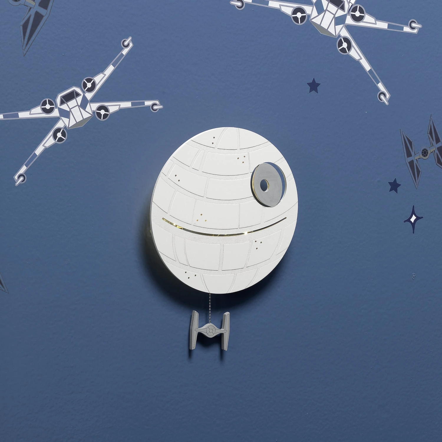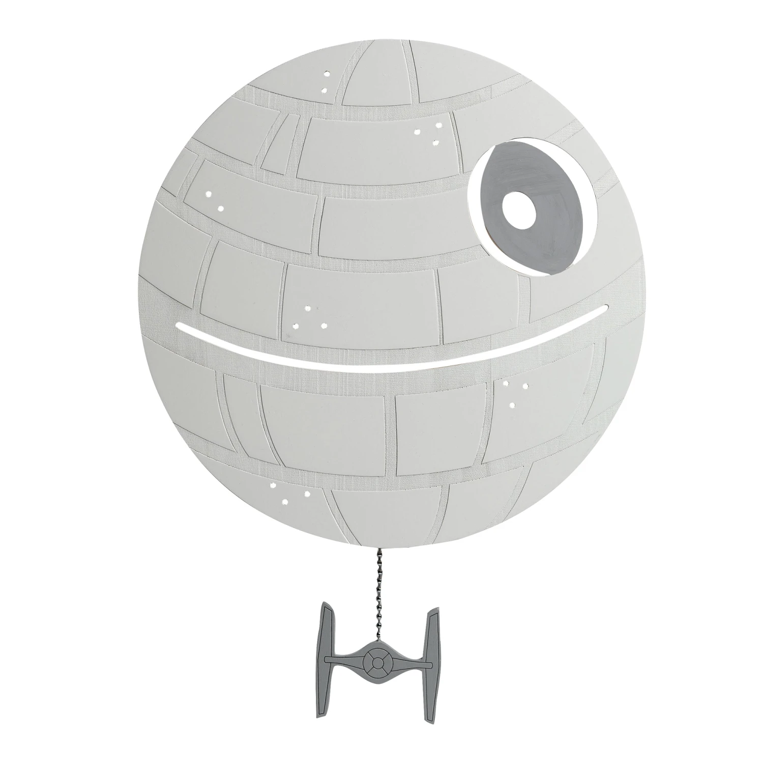 Every Star Wars fan is sure to love this light-up Death Star wall decor, as the Death Star is a cultural icon. It is back lit with an LED light which requires 3 AAA batteries, not included. There are multiple light emitting openings that add interest and dimension to this amazing light up wall decor. At the bottom a Tie Fighter hangs from a metal chain to power this space station on or off. This is an awesome gift to welcome home your little padawan (Jedi in training) and is a top baby registry pick as well. SKU: 871512, UPC: 084122012943.