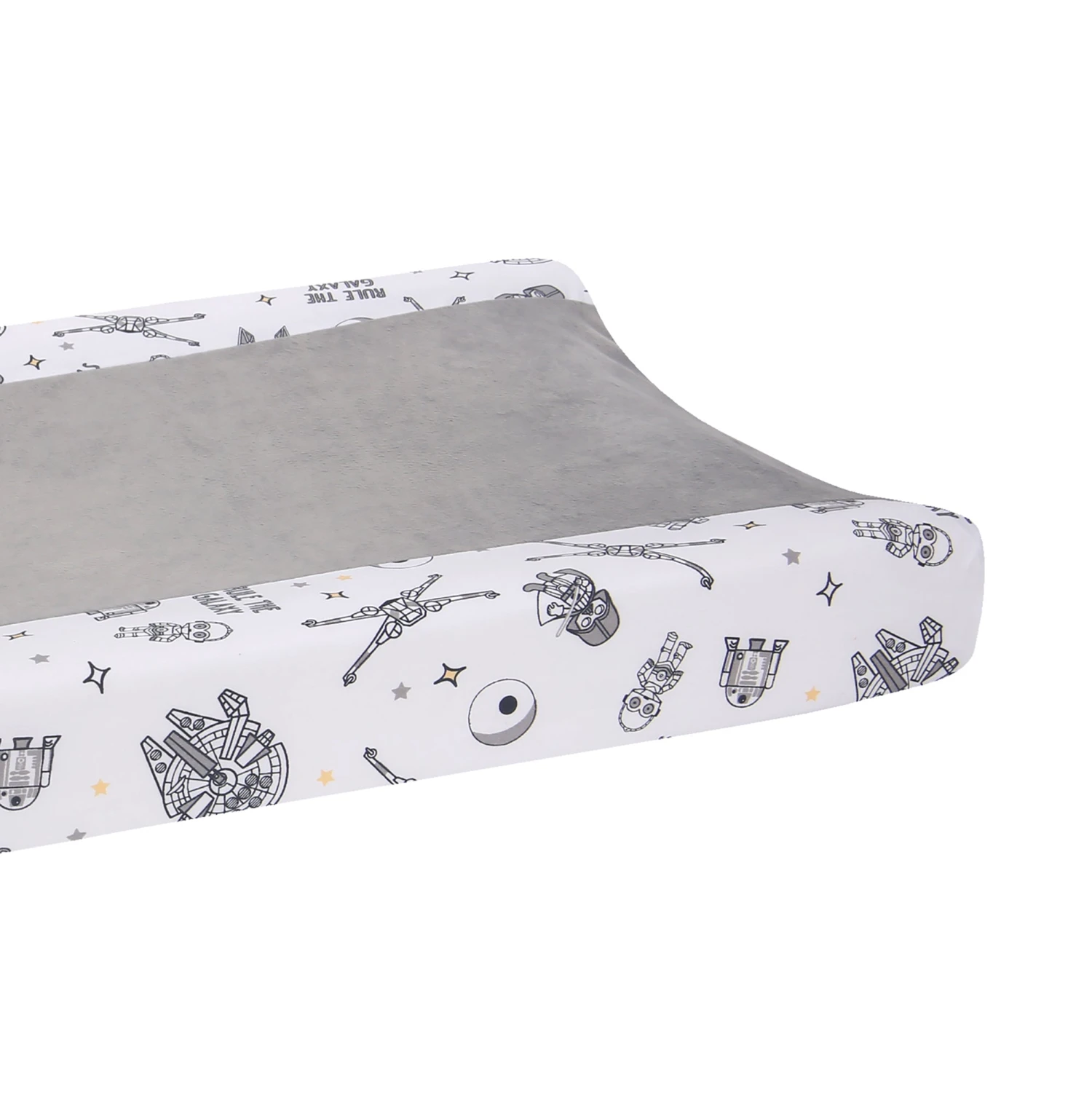 A soft gray cozy polyester minky center is perfect for changing your little padawan (Jedi in training). The side panels are cotton and feature Tie Fighters, the Death Star, Darth Vader, R2D2, C-3P0, X-Wings and tossed gray and yellow stars. There are summaryholes for the changing pad straps so your little one is safe and secure while getting their diaper changed. There is elastic on the short sides in order to fit securely on a standard-sized changing pad measuring 32″ x 16″. It is machine washable for easy care. SKU: 871550, UPC: 084122013704.