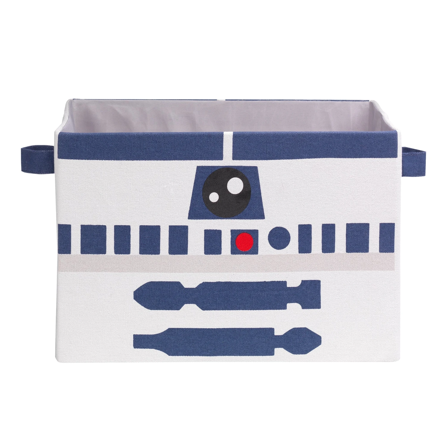 Beep, Beep. I am your R2D2 collapsible storage. My sturdy outer shell is made of a cotton polyester blend with a gray inner lining. I have two blue canvas side handles for easy carrying. I’m 12 1/2” X 11” X 9”. I have a white canvas body and make a perfect galactic gift for all Star Wars fans. SKU: 871549R, UPC: 084122012912.