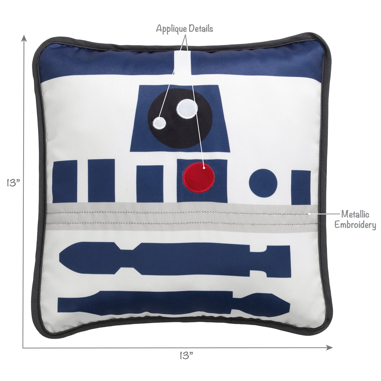 Celebrate Star Wars favorite little Droid with this unique officially licensed R2-D2 decorative pillow. It is perfectly sized at 13” X 13” X 3”. It is printed on a white ground with touches of applique and metallic embroidery. The vertical opening at the back allows for washing the cover separately. This loyal little droid pillow makes a stylish and fun welcome home baby gift for any little padawan (Jedi in training) and is a top baby registry pick. SKU: 871503R, UPC: 084122012882.