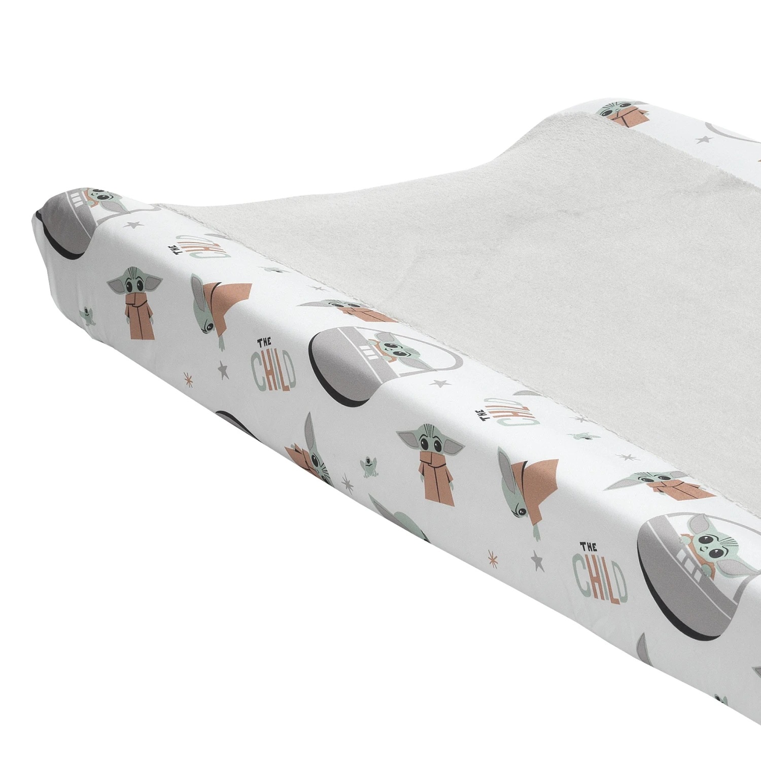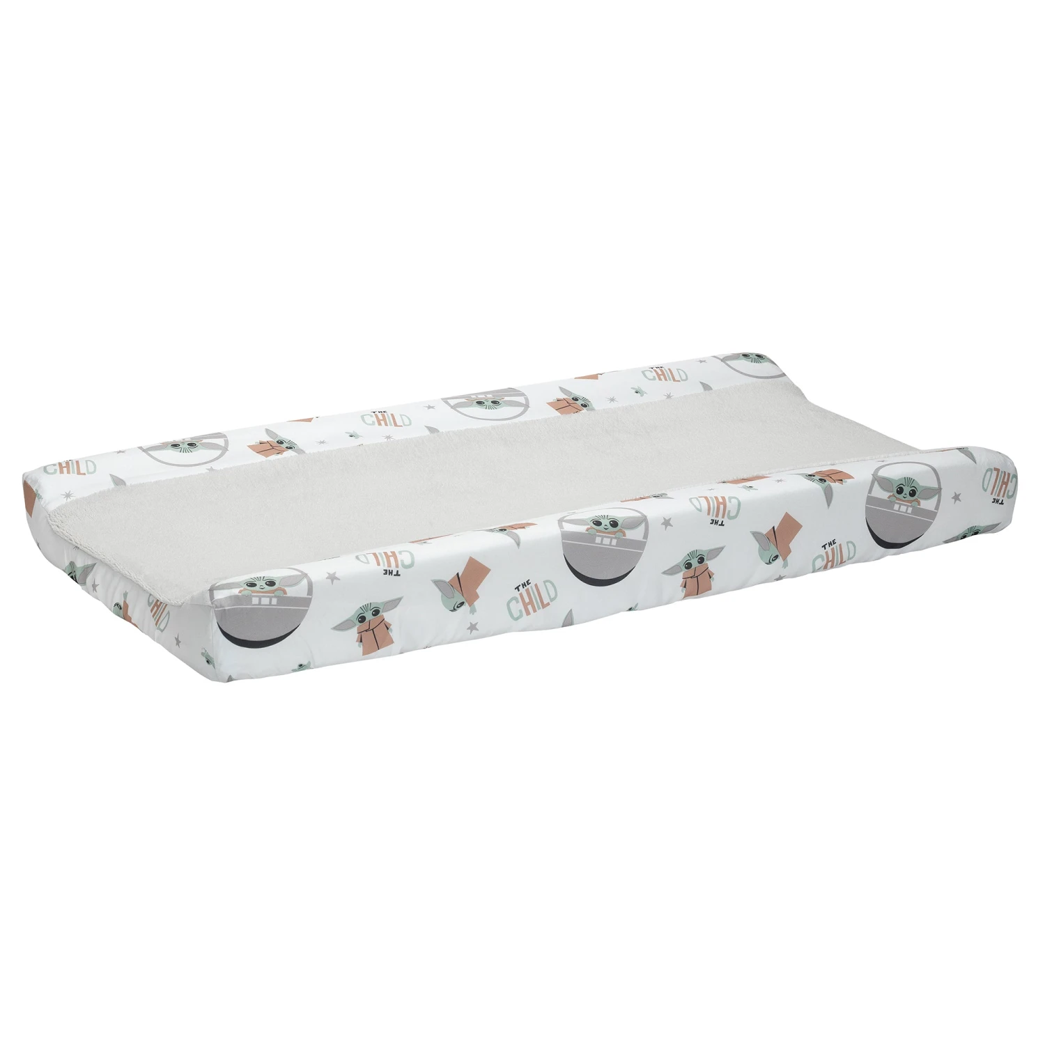 A trendy gray soft luxurious coral fleece center is perfect for changing your little one. The side panels are a soft microfiber featuring Baby Yoda in different poses along with the words “The Child”. There are summaryholes for the changing pad straps so your little one is safe and secure while getting their diaper changed. It is machine washable for easy care. Fits most standard size changing pads. SKU: 871850, UPC: 084122013773.