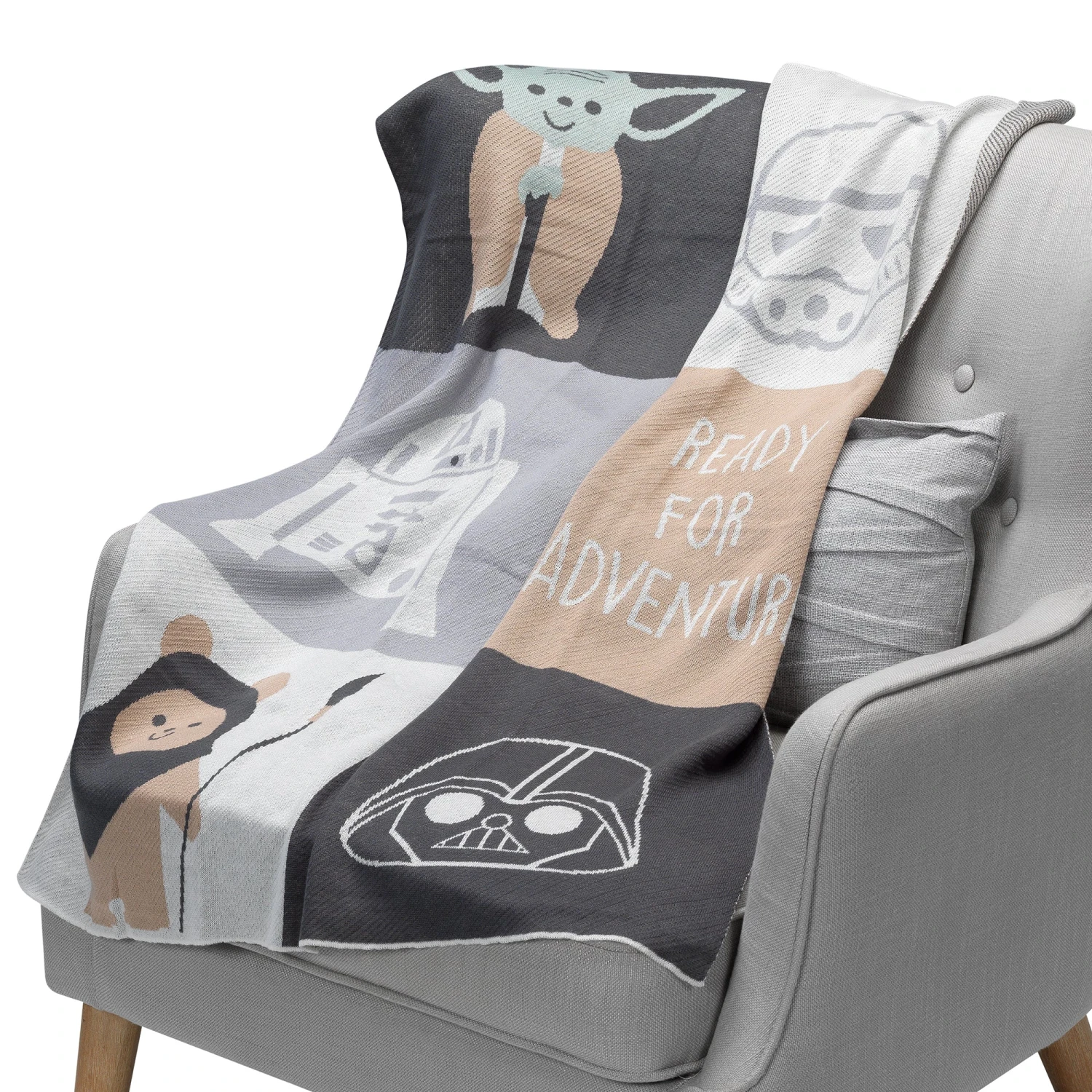 This soft knitted patchwork blanket is made with luxurious acrylic yarns. It features Yoda with his light saber, the helmet of Darth Vader, a gray and white R2-D2, an Ewok holding his pewter spear, a Storm Trooper helmet, and the verbiage “Ready for Adventure”. Your little one will love cuddling in this perfectly sized stroller blanket that is 30” X 40”. It makes a great baby shower gift or welcome home baby gift and is a top baby registry pick. SKU: 871434FF, UPC: 084122012592.