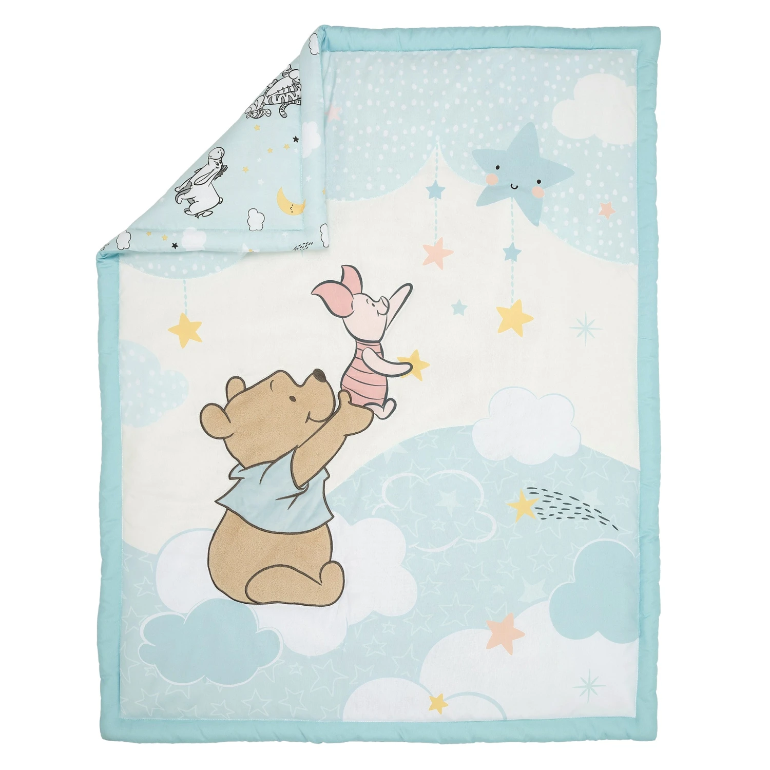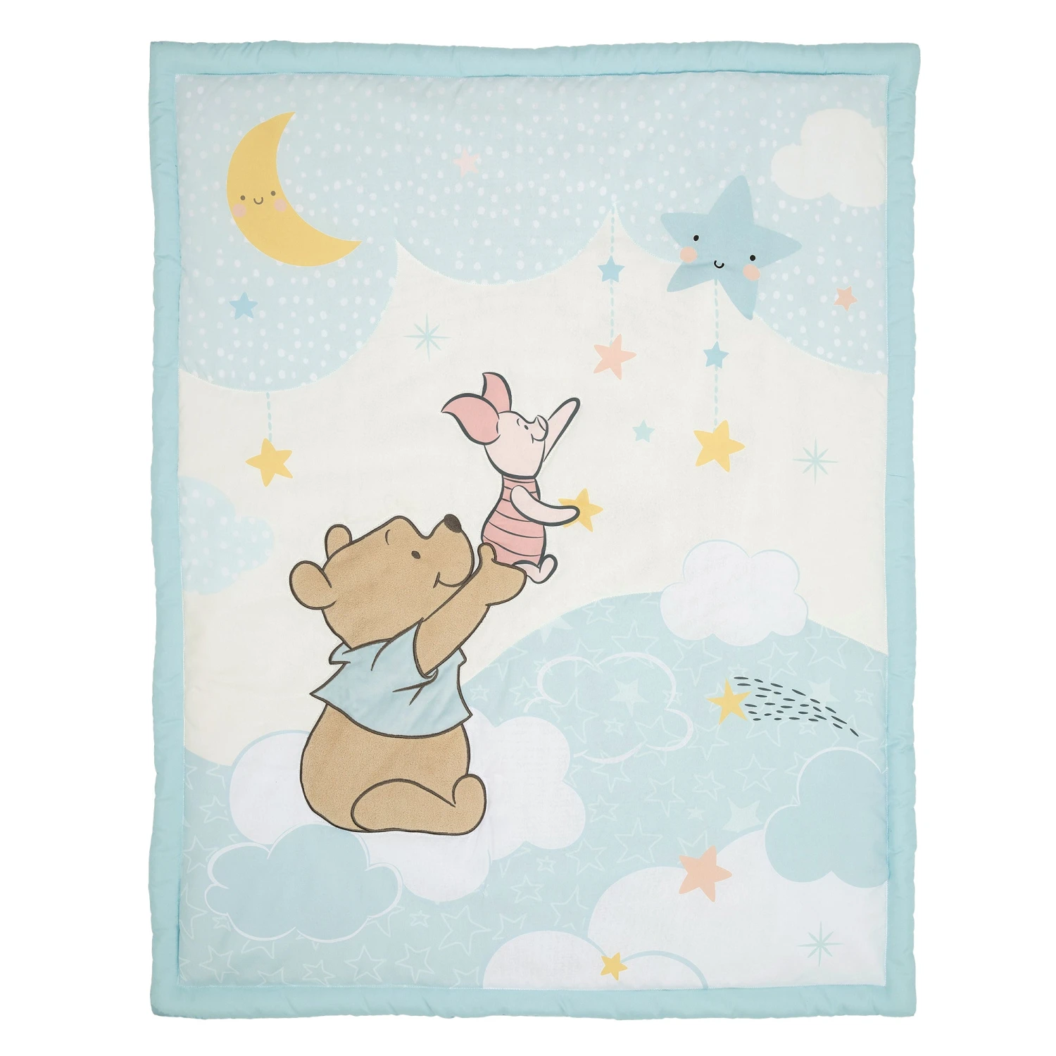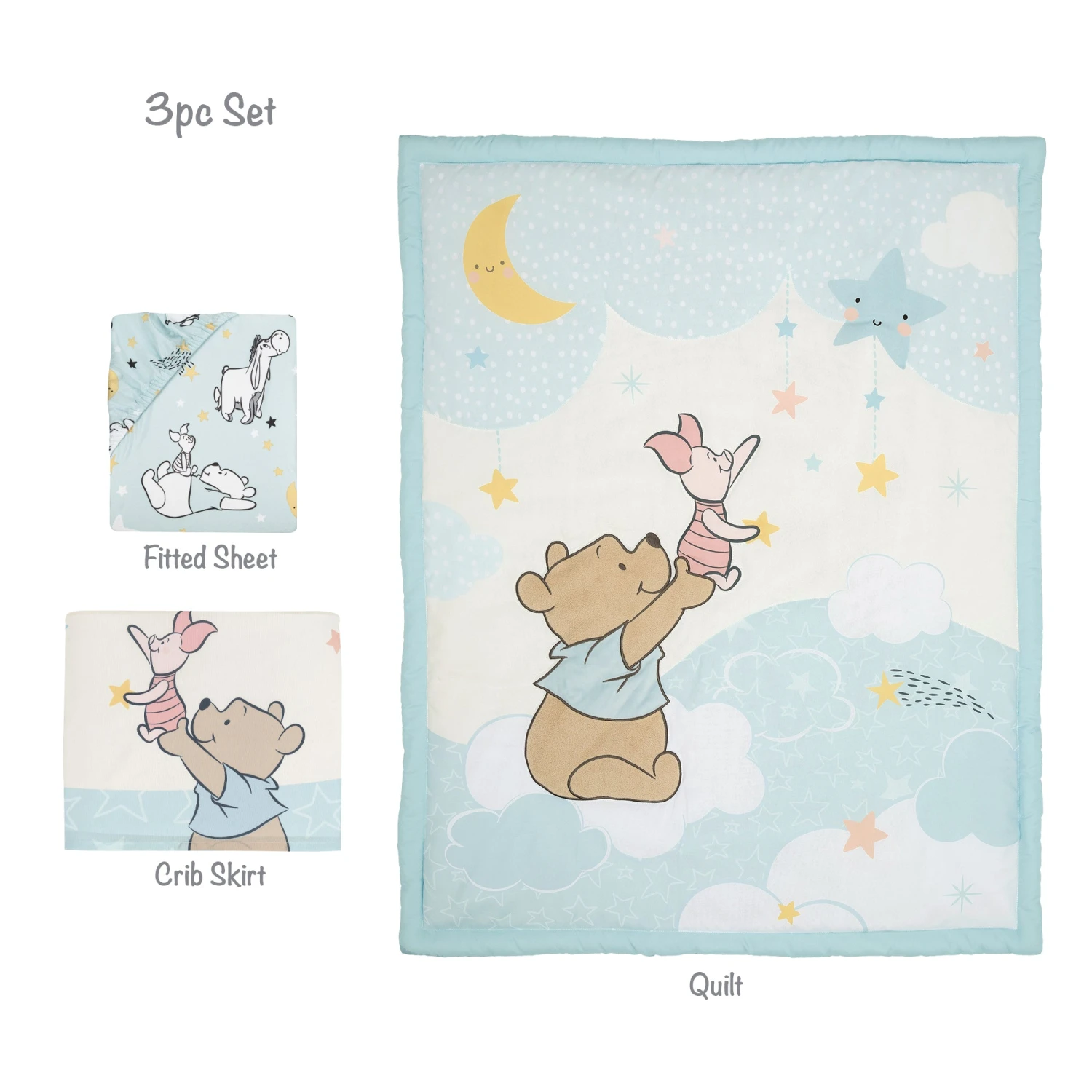Add a little Disney magic to your child’s sleep space with this charming Starlight Pooh Collection. The 3-piece set includes one quilt, one fitted crib sheet and one crib skirt. It is made of a super soft microfiber material. Winnie the Pooh is fully appliqued in a tan color textured boucle material, and he is wearing his favorite blue velour shirt. Pooh is holding Piglet who is reaching for a star and is surrounded by fluffy clouds and a yellow crescent moon. The fitted crib sheet is a baby blue ground with Pooh, Piglet, Tigger and Eeyore along with stars, moons and clouds. There is elastic all the way around the fitted crib sheet ensuring a safe and secure fit on a standard-sized crib mattress measuring 28” X 52”. The crib skirt adds the finishing touch to your child’s crib. It is creamy white and pastel blue with tossed stars. On the right corner is Pooh holding Piglet and the left side features Tigger and Eeyore standing side by side admiring the starry sky. SKU: 792003V, UPC: 084122017221.
