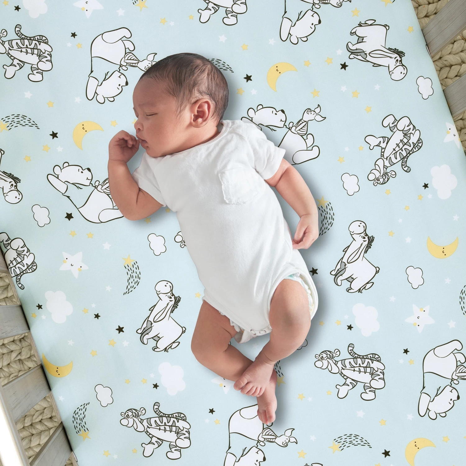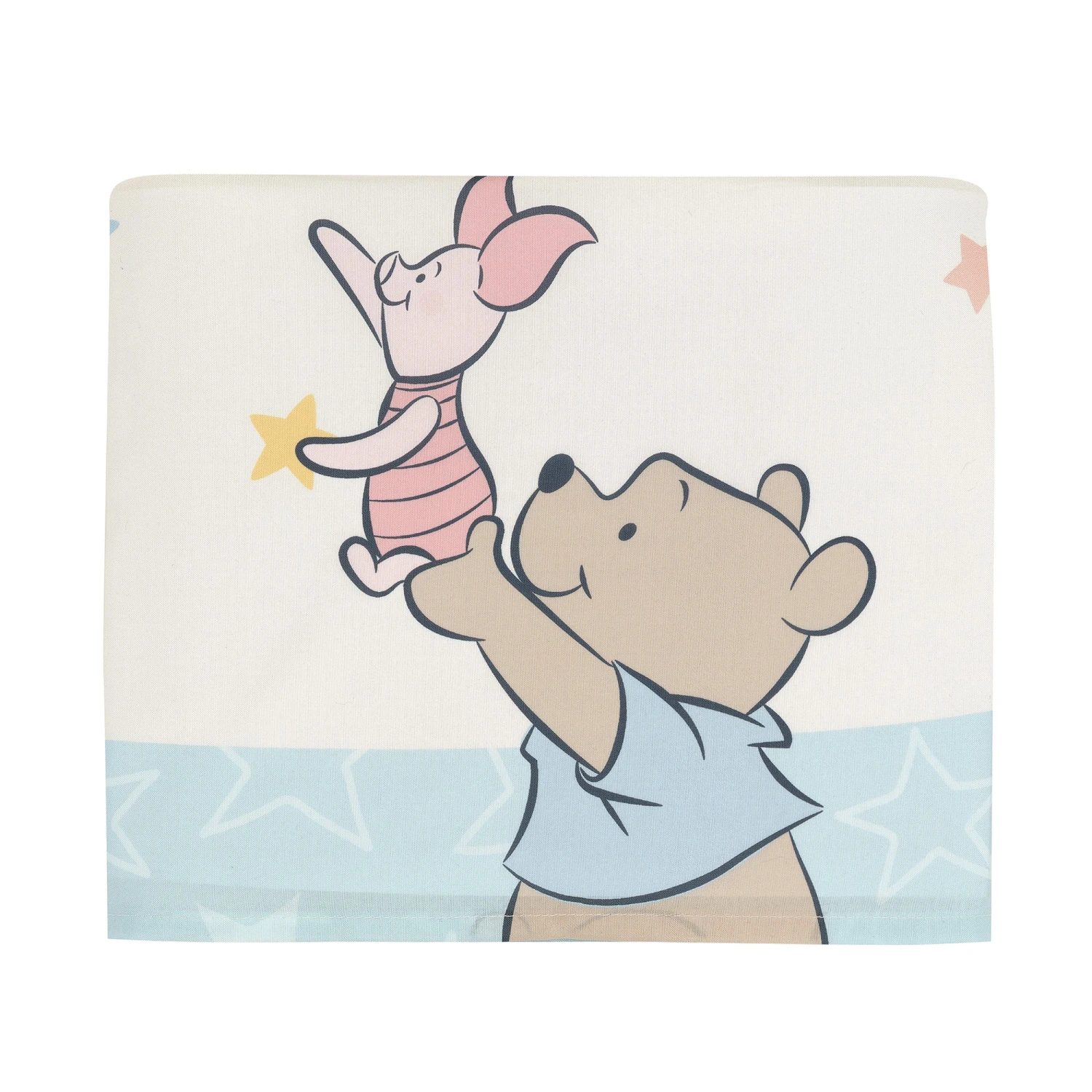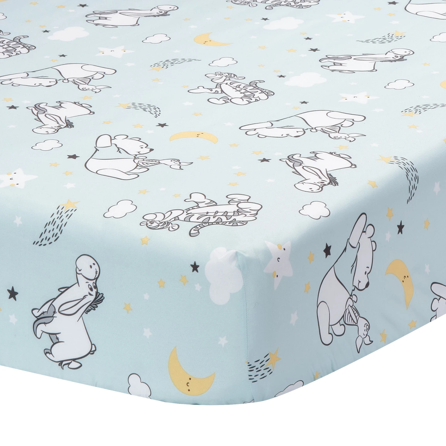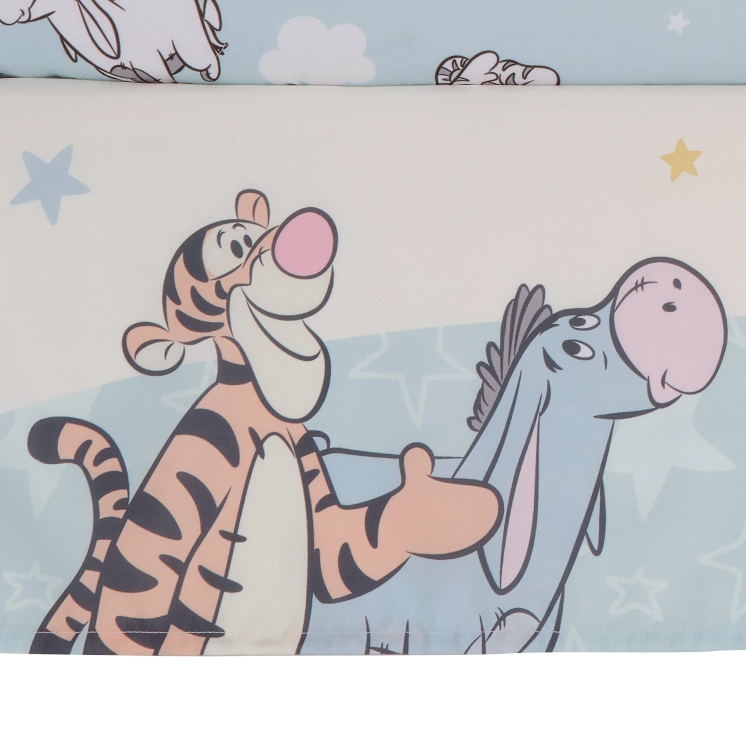 Add a little Disney magic to your child’s sleep space with this charming Starlight Pooh Collection. The 3-piece set includes one quilt, one fitted crib sheet and one crib skirt. It is made of a super soft microfiber material. Winnie the Pooh is fully appliqued in a tan color textured boucle material, and he is wearing his favorite blue velour shirt. Pooh is holding Piglet who is reaching for a star and is surrounded by fluffy clouds and a yellow crescent moon. The fitted crib sheet is a baby blue ground with Pooh, Piglet, Tigger and Eeyore along with stars, moons and clouds. There is elastic all the way around the fitted crib sheet ensuring a safe and secure fit on a standard-sized crib mattress measuring 28” X 52”. The crib skirt adds the finishing touch to your child’s crib. It is creamy white and pastel blue with tossed stars. On the right corner is Pooh holding Piglet and the left side features Tigger and Eeyore standing side by side admiring the starry sky. SKU: 792003V, UPC: 084122017221.