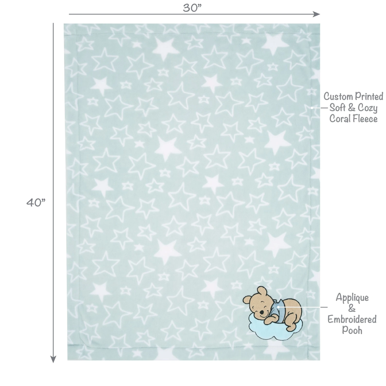 This officially licensed Disney Winnie the Pooh blanket features your favorite little bear resting on a soft blue minky cloud. Pooh is made in a tan textured boucle fabric and is wearing his favorite blue velour shirt. The blanket is 30” X 40” with white silhouette stars on a baby blue fleece ground. This blanket makes a great baby shower gift or welcome home baby gift and is a top baby registry pick. SKU: 792034, UPC: 084122017252.