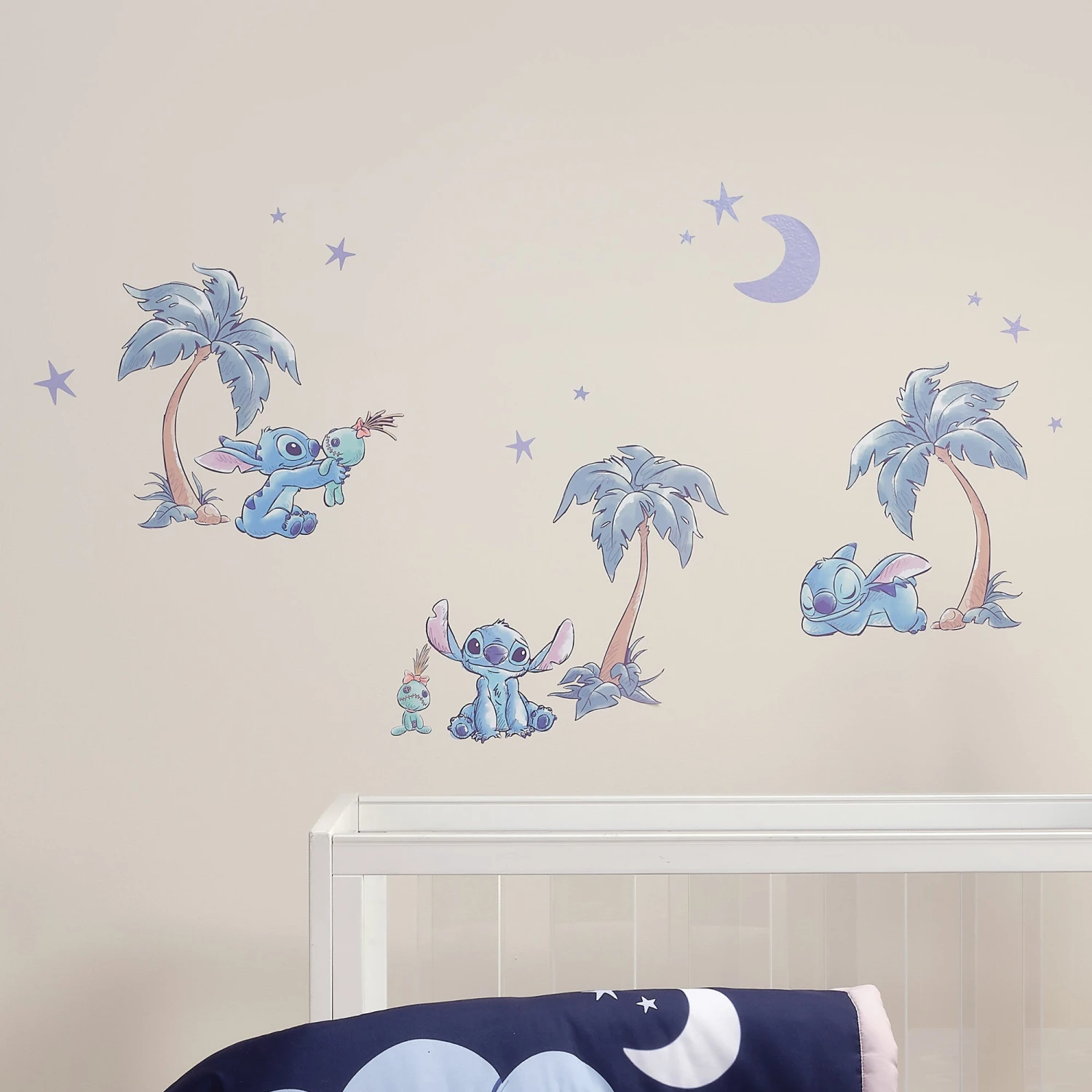 A great way to add a feature wall in your child’s room is with these custom wall decals. There are three sheets that are 12 inches by 18 inches each with a total of 19 pre-cut stickers/decals. Included are 3 palm trees, 3 different poses of Stitch, 2 poses with Scrump, a crescent moon and 11 blue stars. The decals are in a pretty watercolor style. The finished size is approximately 20 inches X 54 inches when applied as shown. SKU: 899148, UPC: 084122020276.