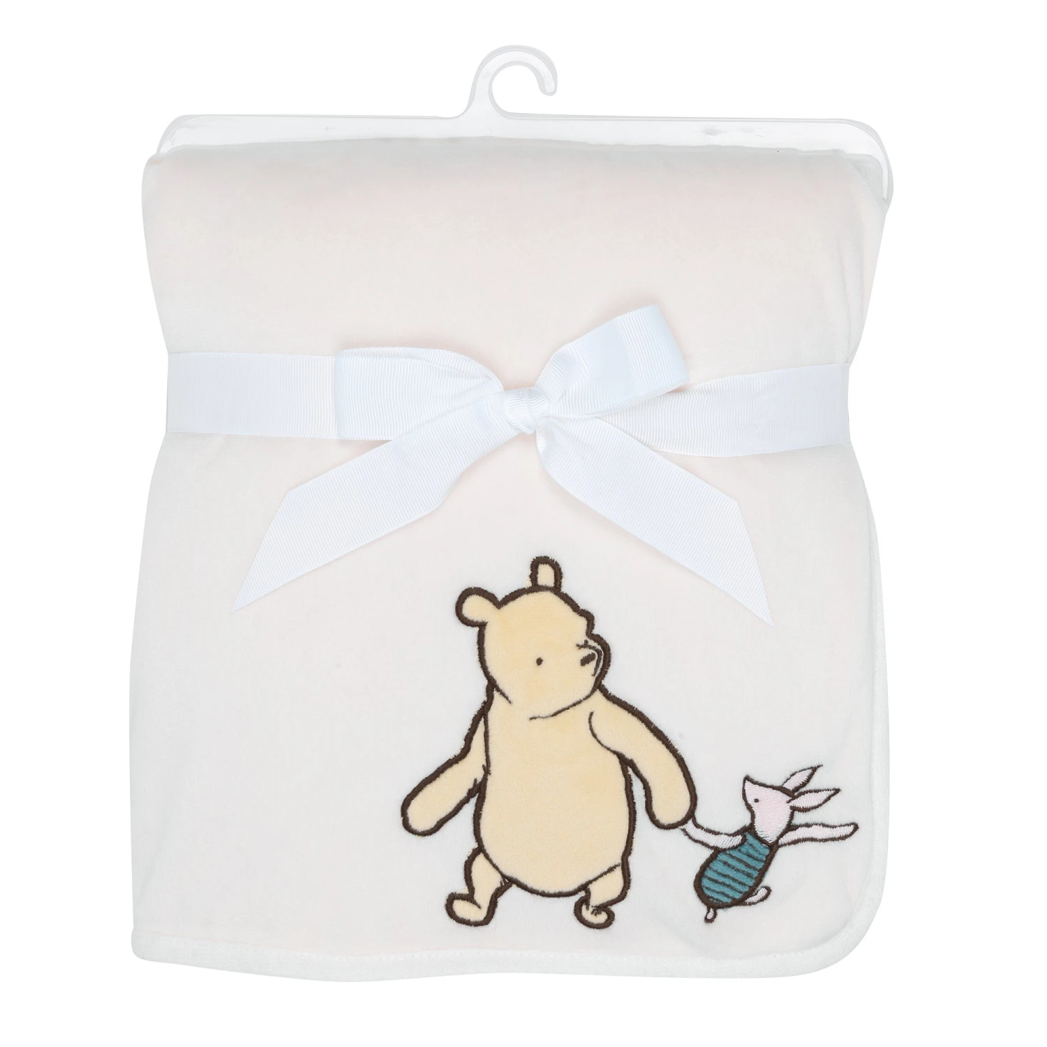 Cuddle your little one in this soft creamy white minky blanket. Disney’s lovable Classic Pooh is appliqued with his forever friend Piglet. The back of this Winnie the Pooh blanket is a luxurious white faux shearling. Sized at 30” X 40” this stroller blanket makes a great baby shower gift and is a favorite baby registry item. SKU: 830034, UPC: 084122011618.