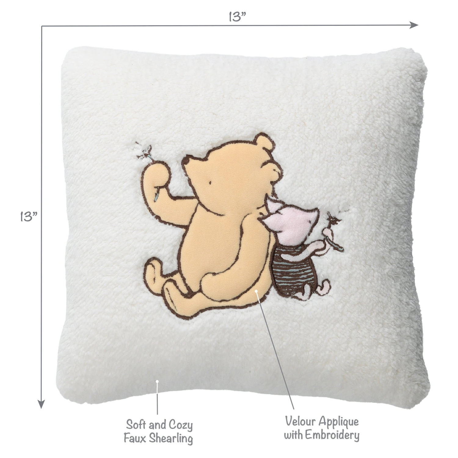 This charming soft and cozy keepsake nursery throw pillow features Classic Pooh back-to-back with his sidekick Piglet. The pillow is made of an ultra-soft creamy white faux shearling. It is 13” X 13” and the center embroidery is 7” X 6”. Winnie the Pooh is a creamy yellow velour with embroidered outlines and Piglet’s body is teal velour with brown embroidered stripes. Both Pooh and Piglet have a dandelion stem in hand. This pillow is machine washable for easy care. SKU: 830003, UPC: 084122014374.
