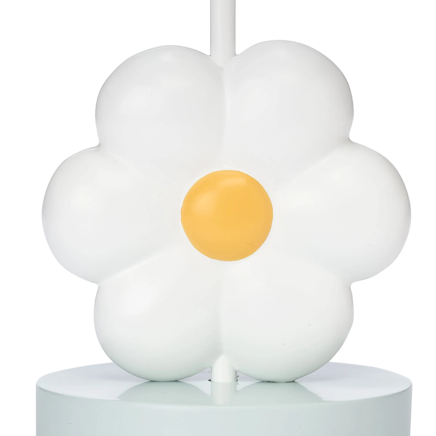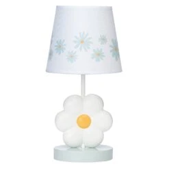 Add a soft glow to your child’s room with this charming custom sculpted nursery lamp and shade. A pretty white daisy that measures 5” tall is centered on a blue aqua mist stand. The coordinating lamp shade is on a white ground with sixteen blue aqua mist daisies. The total height of the lamp and shade is approximately 14”. The lamp comes complete with an energy-efficient light bulb (equivalent to 60 watts) that uses less energy. SKU: 722024B, UPC: 084122014930.