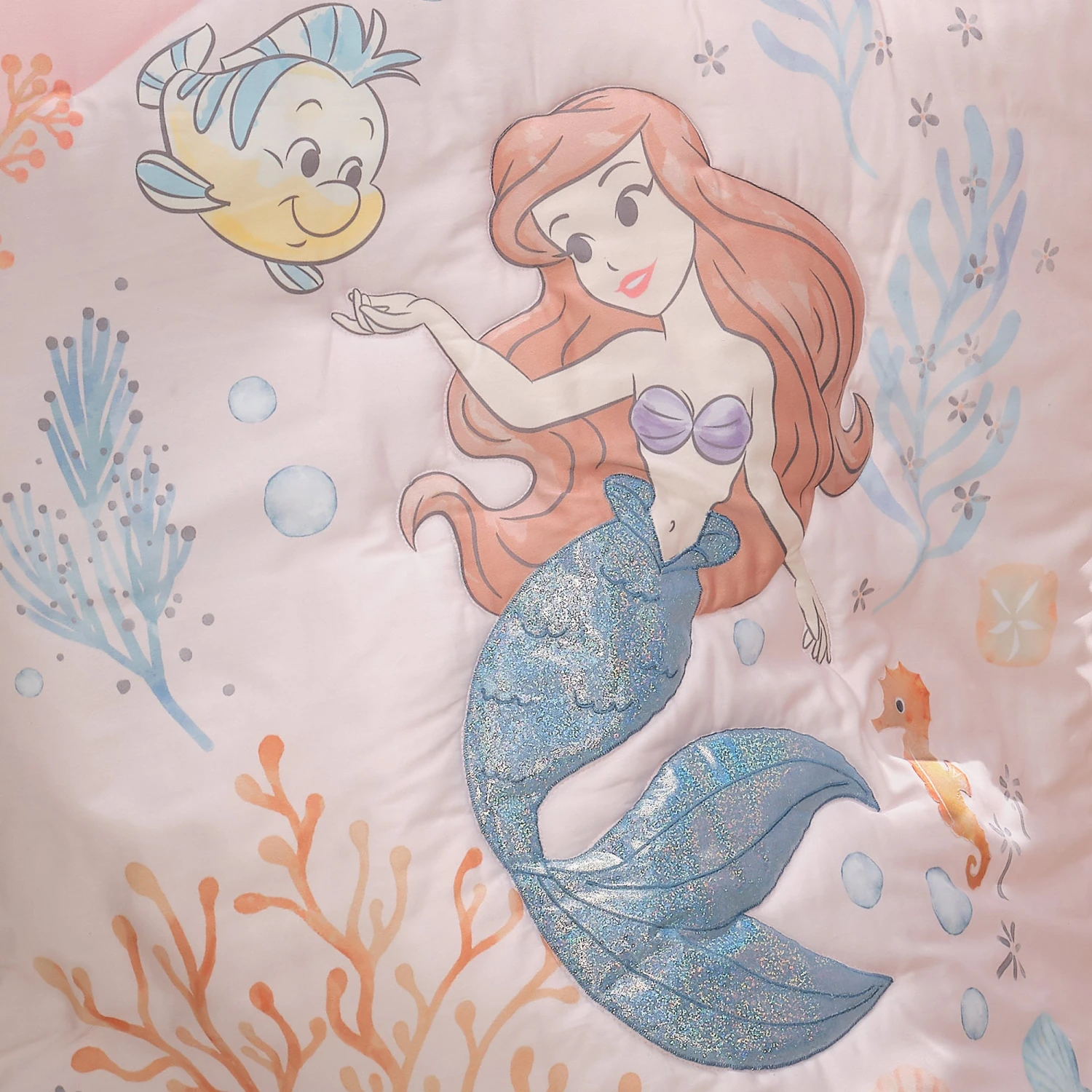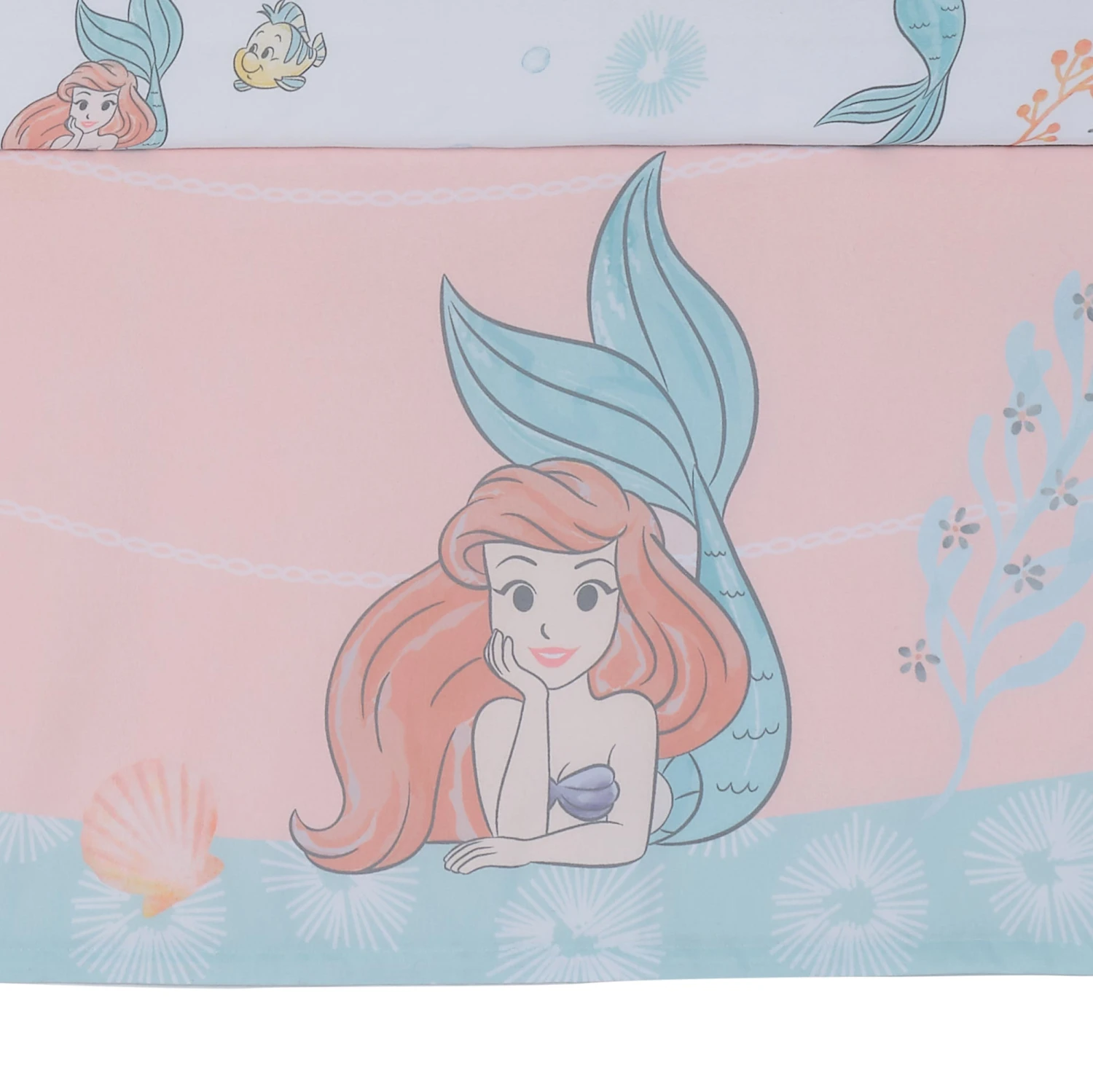 Celebrate the magic of The Little Mermaid with this amazing nursery crib bedding collection. The three-piece baby bedding set includes one quilt, one fitted crib sheet and one crib skirt all beautifully designed in a lovely watercolor palette with soft hues of coral, peach, seafoam, and sky blue. Ariel’s sparkling tail with dyed to match embroidery adds the “wow” to this collection. The quilt is a great way to enjoy tummy time with your little one. The fitted crib sheet features Ariel, Flounder, seahorses, seashells, coral, and bubbles. It is made in soft microfiber that is gentle on baby’s skin. It has elastic all the way around ensuring a safe and secure fit on a standard size crib mattress. The crib skirt adds the finishing touch to your child’s crib. It is a light peach on top and light seafoam on the bottom. The far-right corner features Ariel with her beautiful flowing hair. This collection is the perfect way to add the royal treatment to your little one’s room. SKU: 248003V, UPC: 084122017603.