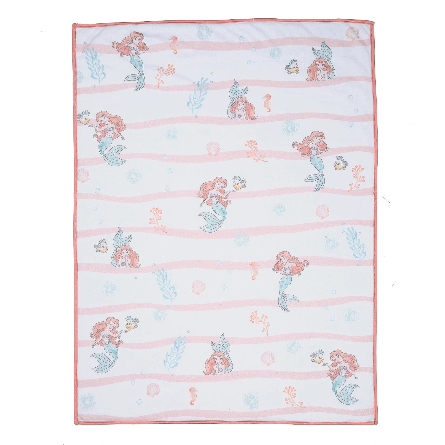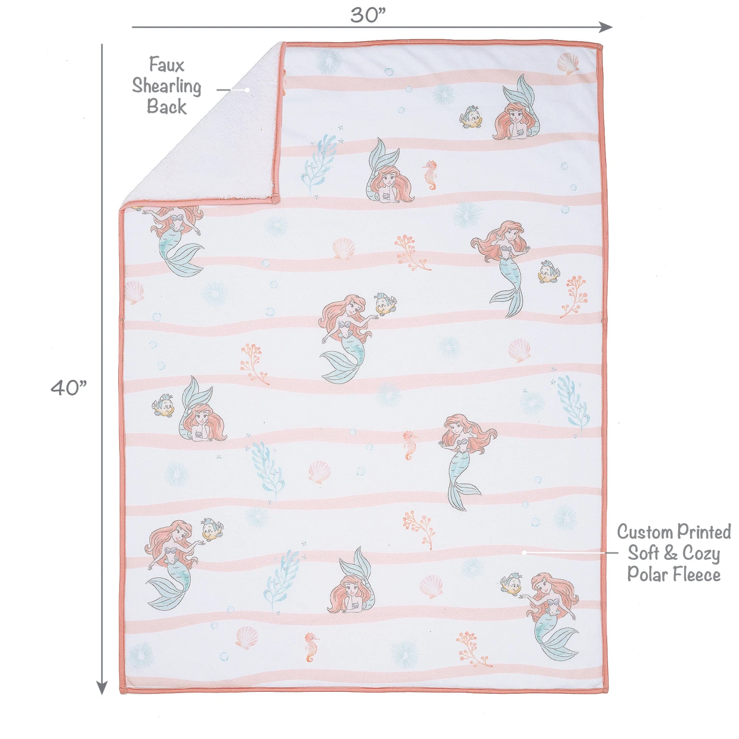 This soft and cozy 30” X 40” baby blanket is the perfect way to cuddle up with your little one and dream of the underwater world of Disney’s The Little Mermaid. The blanket features a vibrantly colored image of Ariel and Flounder swimming through the coral reef. It is made of soft fleece on the front side and white cozy faux shearling on the back. It makes a great baby shower gift or welcome home baby gift. It is machine washable for easy care. SKU: 248034, UPC: 084122017627.